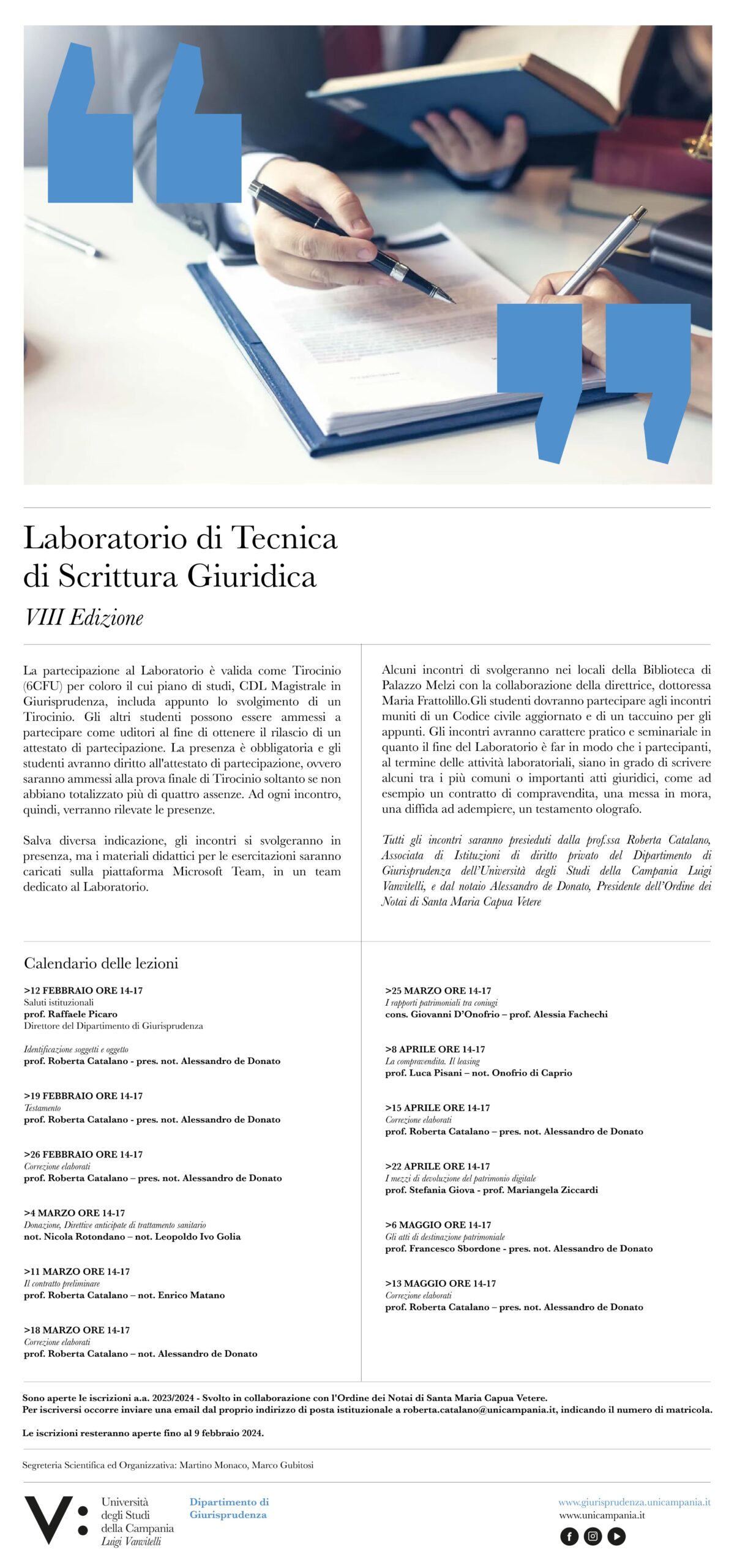Il 12 febbraio 2024 ha preso il via il Laboratorio di Tecnica della Scrittura Giuridica, giunto alla sua VIII edizione, organizzato dalla cattedra di diritto privato dell’Università degli Studi della Campania Luigi Vanvitelli, in collaborazione con il Consiglio Notarile di Santa Maria Capua Vetere.