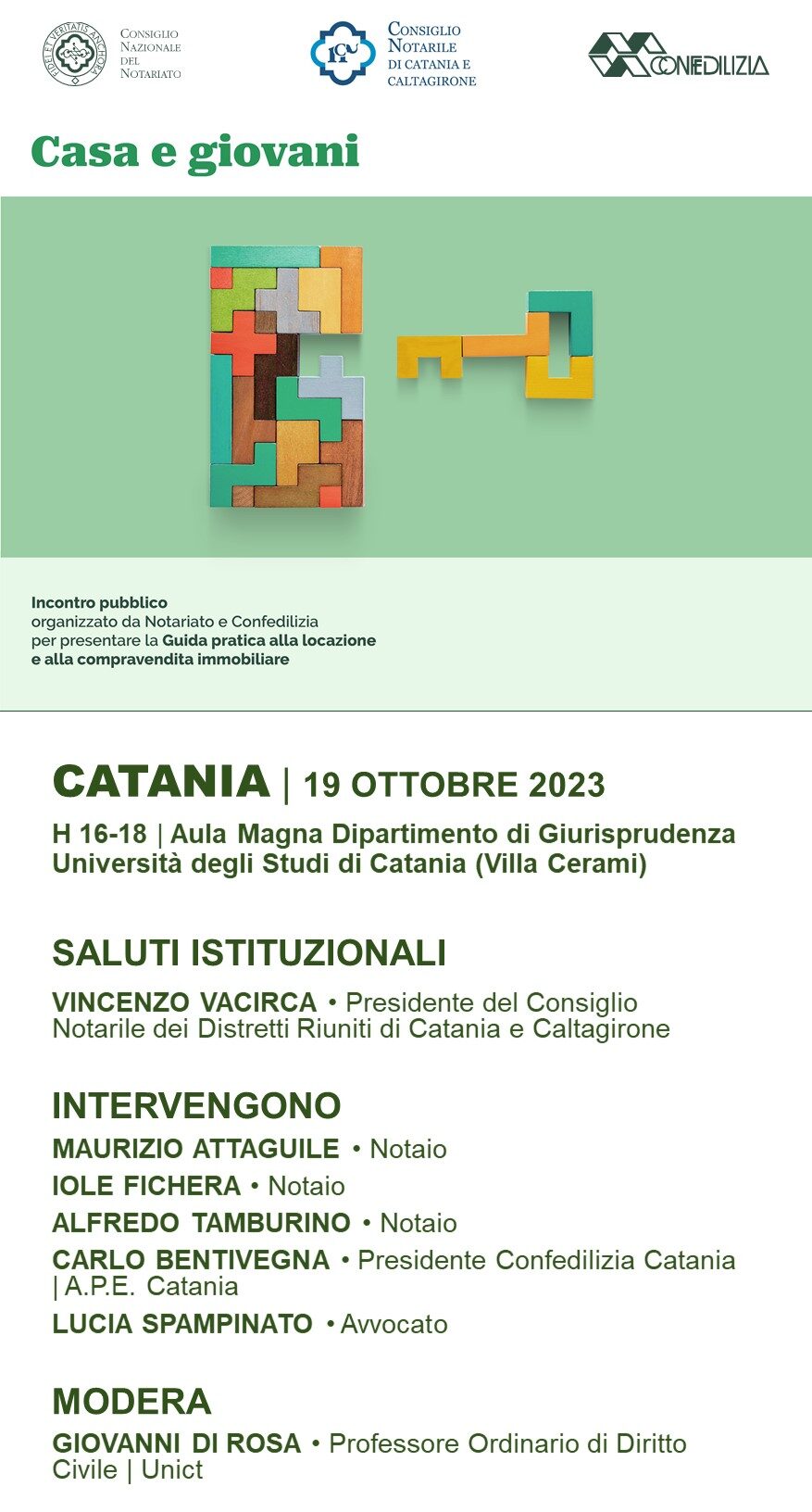 Catania, 19 ottobre 2023 – Si terrà il 19 ottobre 2023, alle ore 16, presso l’Aula Magna del Dipartimento di Giurisprudenza dell’Università degli Studi di Catania (Villa Cerami), l’incontro pubblico promosso dal Consiglio Notarile dei distretti riuniti di Catania e Caltagirone, per presentare la Guida pratica alla locazione e alla compravendita immobiliare “Casa e Giovani”, realizzata dal Consiglio Nazionale del Notariato e da Confedilizia, l’Associazione dei proprietari di casa, per accompagnare e orientare le giovani generazioni nella scelta della soluzione abitativa più adeguata alle proprie esigenze.