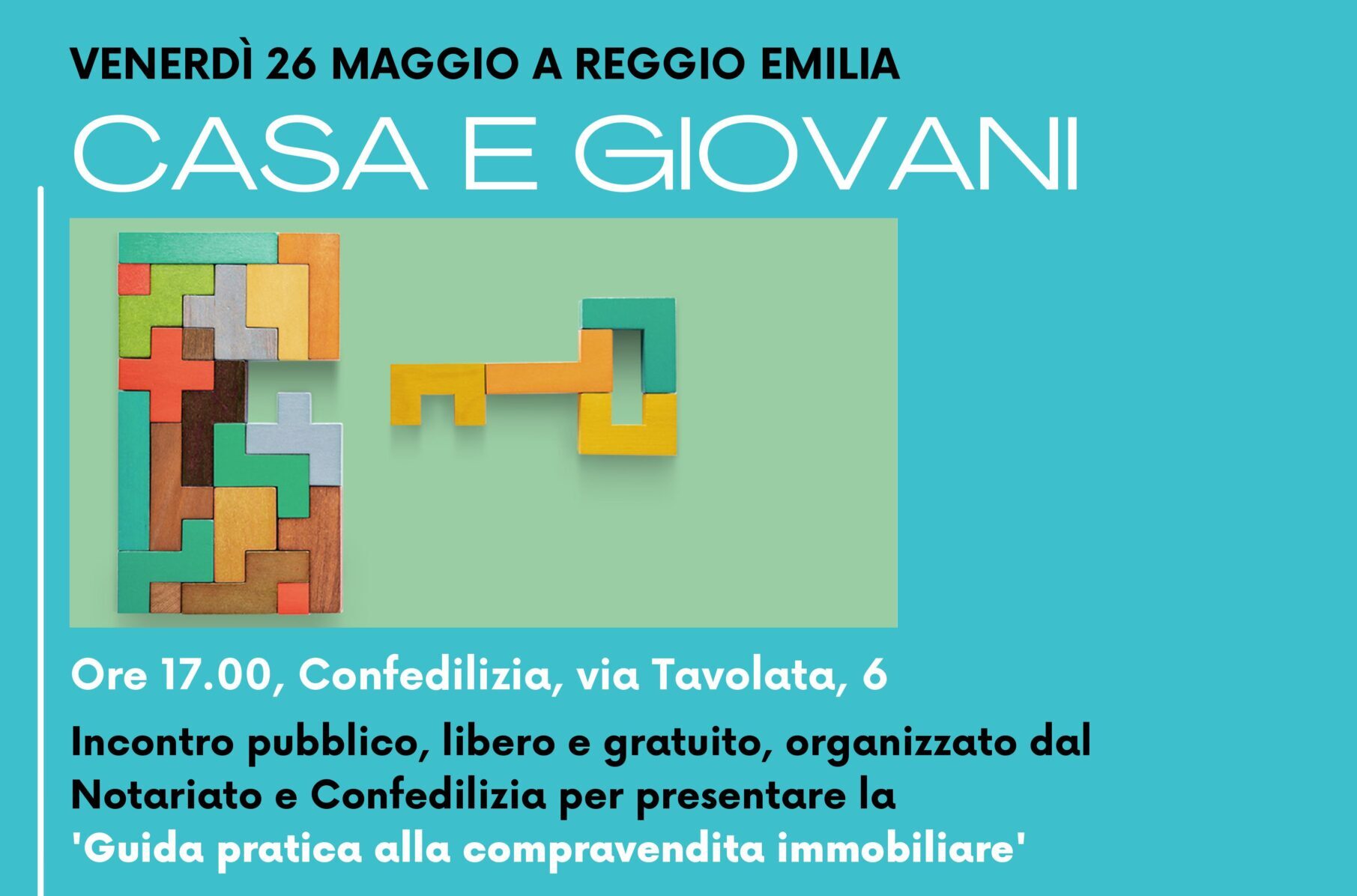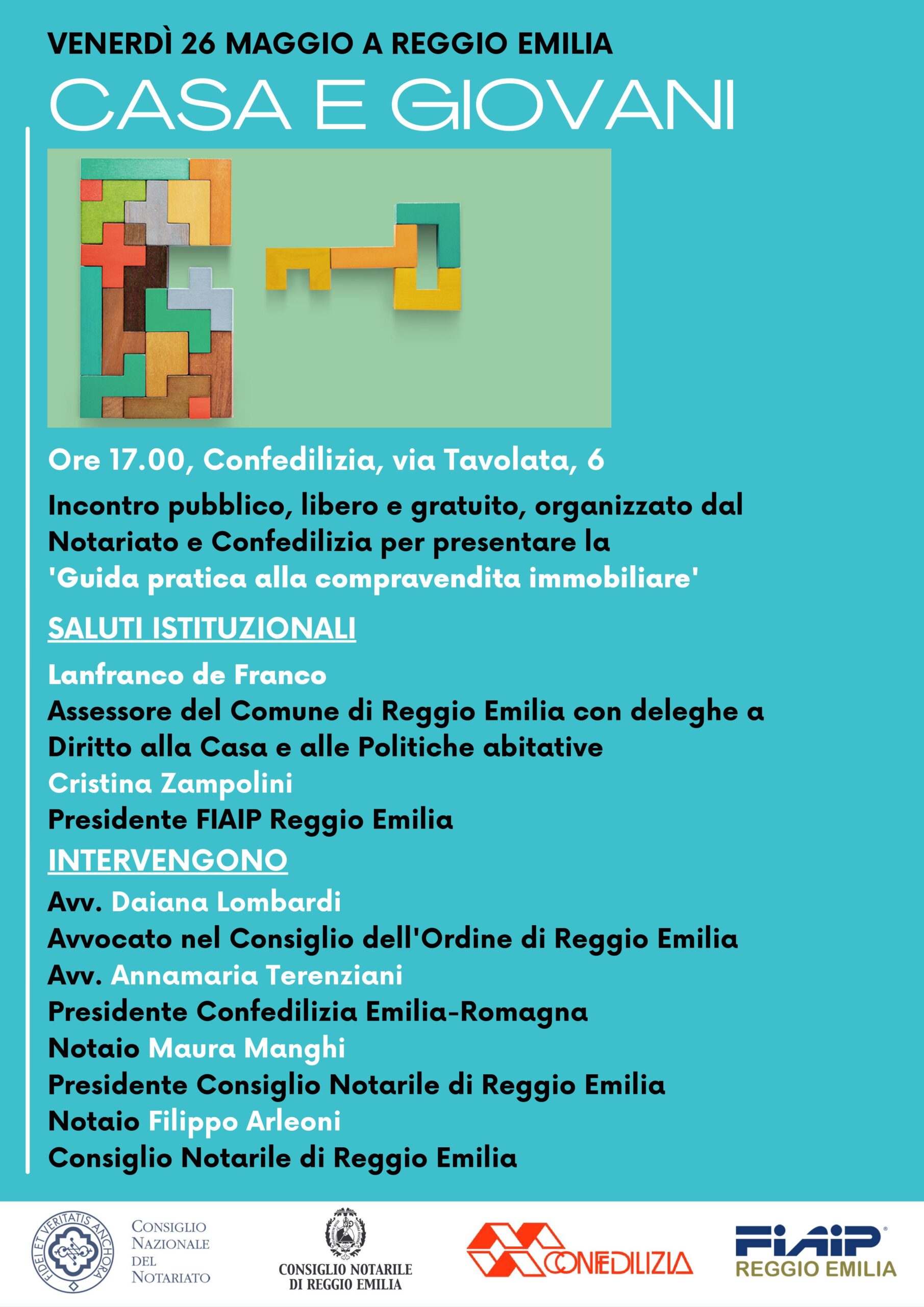 A queste e altre domande sarà data risposta venerdì 26 maggio a Reggio Emilia, quando, alle ore 17.00, presso la sede di Confedilizia, in via Tavolata n°6, i cittadini potranno partecipare a Casa e Giovani, l’incontro pubblico e gratuito promosso dal Consiglio Notarile insieme a Confedilizia e a FIAIP (Federazione Italiana degli Agenti Immobiliari Professionali). L’ingresso è libero e gratuito sino a esaurimento dei posti disponibili.