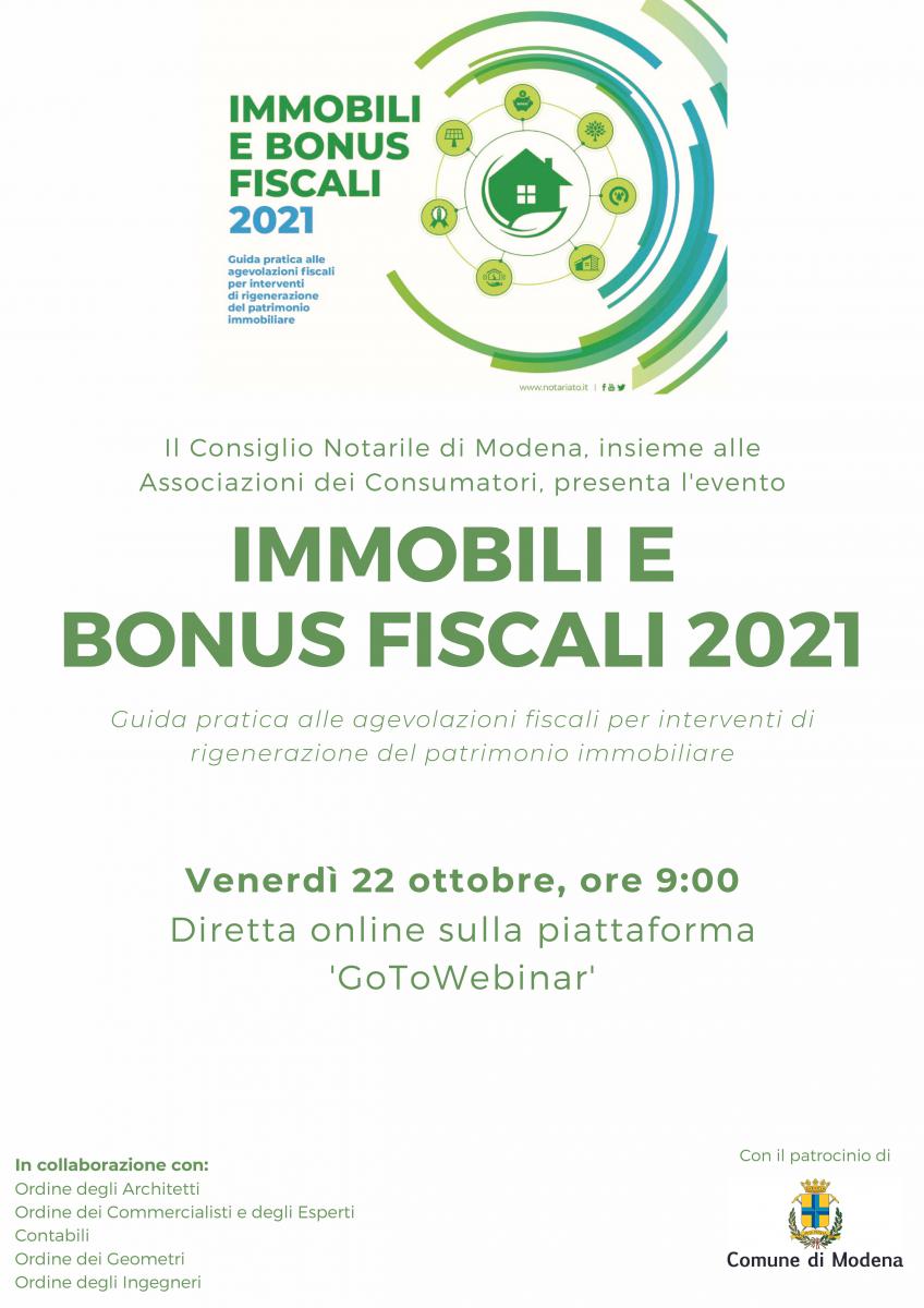 A tale proposito diventa quanto mai fondamentale il supporto dei professionisti: per questo, il prossimo venerdì 22 ottobre, il Consiglio Notarile di Modena, insieme alle Associazioni dei Consumatori, con il patrocinio del Comune e in collaborazione con gli Ordini degli Architetti, dei Dottori Commercialisti ed Esperti Contabili dei Geometri e degli Ingegneri, presenterà Immobili e bonus fiscali 2021 – Guida pratica alle agevolazioni fiscali per interventi di rigenerazione del patrimonio immobiliare, realizzata dal Consiglio Nazionale del Notariato in condivisione con le principali Associazioni Consumatori del Territorio Nazionale.
