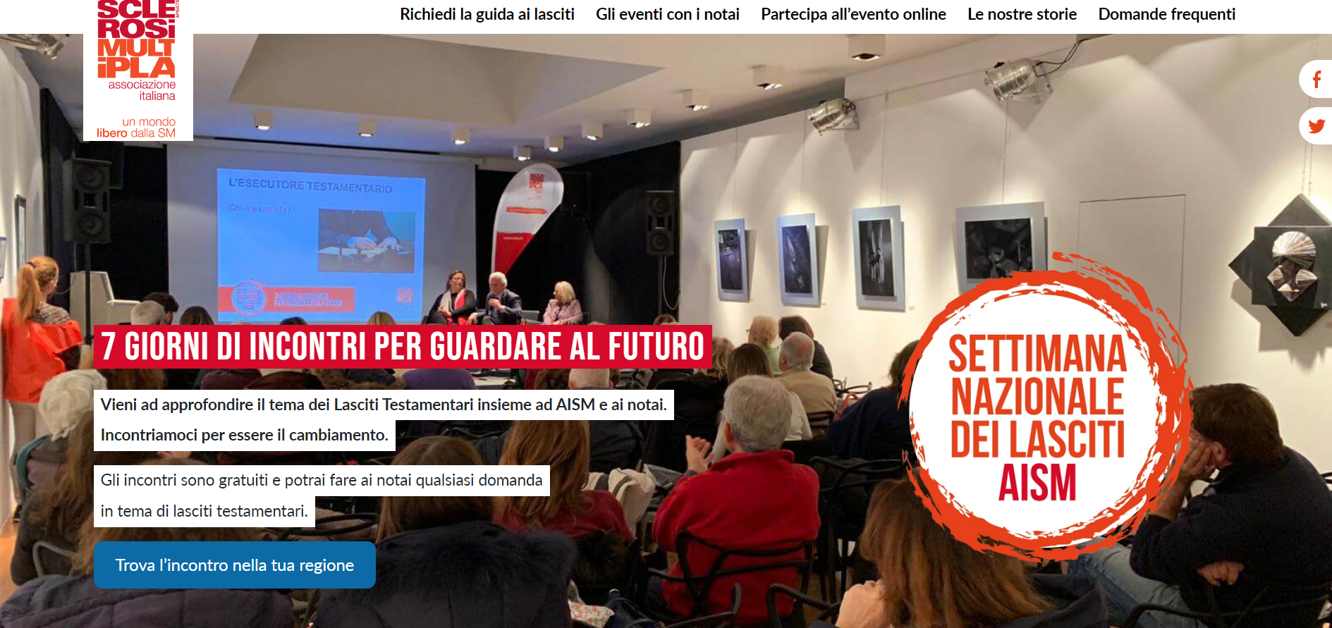 Oltre a informare sul diritto successorio, tutti questi incontri, insieme alla campagna “Il futuro sei tu” che li accompagna, hanno l’obiettivo di aumentare la consapevolezza, in ogni cittadino, sull’importanza di fare testamento e di poter decidere di contribuire a migliorare il futuro di molte persone con sclerosi multipla e dei loro familiari, affidando il proprio impegno a una semplice volontà mediante un lascito solidale. La campagna, che ha il patrocinio del Consiglio Nazionale del Notariato, prevede una pianificazione su stampa, web e digital e uno spot video da 60” in onda sulle principali tv e canali satellitari e sarà diffusa anche sui social network dell’Associazione con l’hashtag #ILFUTUROSEITU.