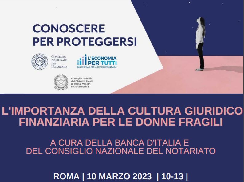 In occasione della Giornata Internazionale dei diritti delle donne, si terrà a Roma venerdì 10 marzo 2023 – a partire dalle ore 10 presso il Centro Convegni Carlo Azeglio Ciampi della Banca d’Italia in via Nazionale 190 -, l’incontro “L’importanza della cultura giuridico – finanziaria per le donne fragili”, organizzato dal Consiglio Notarile di Roma e promosso dal Consiglio Nazionale del Notariato in collaborazione con Banca d’Italia dedicato alla formazione giuridico – finanziaria delle donne, intesa come strumento di prevenzione della violenza economica.