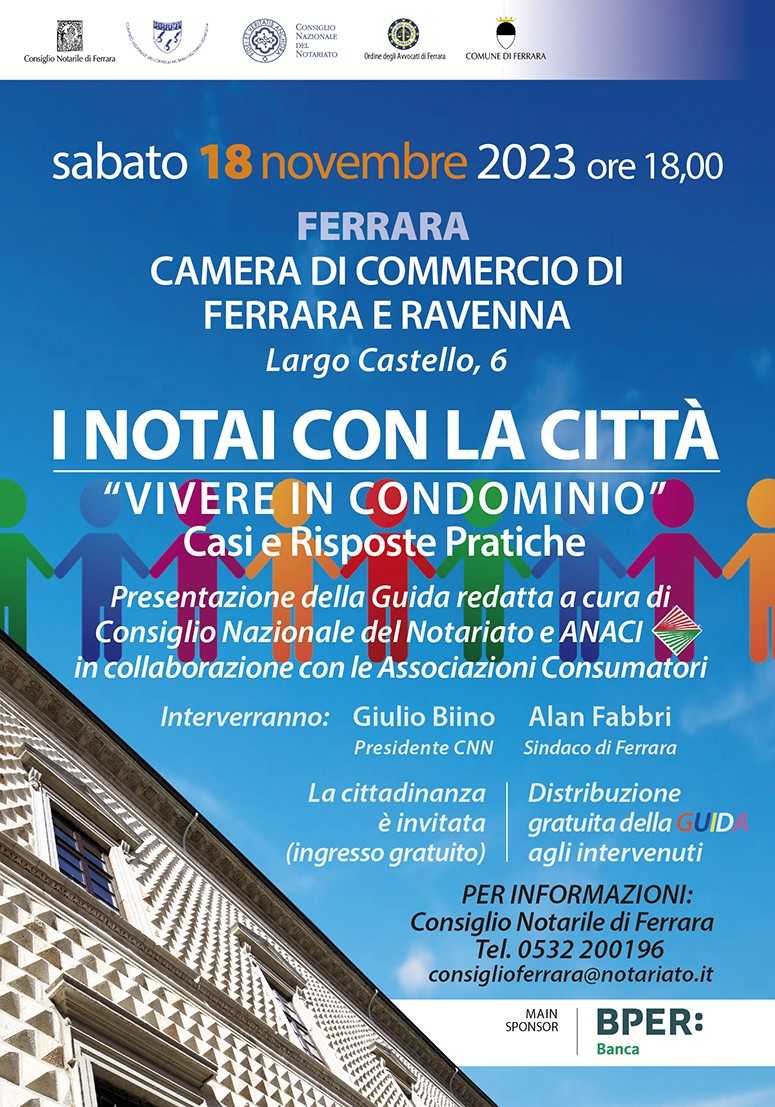 Per questo, sabato 18 novembre alle ore 18.00 si terrà, a Ferrara, presso la Camera di Commercio di Ferrara e Ravenna (in Largo Castello, 6), Vivere in condominio. Casi e risposte pratiche, incontro pubblico e gratuito, aperto a tutta la cittadinanza, nel corso del quale sarà presentata la Guida sul tema, redatta dal Consiglio Nazionale del Notariato insieme alle Associazioni dei Consumatori ed ANACI (Associazione Nazionale Amministratori Condominiali e Immobiliari).