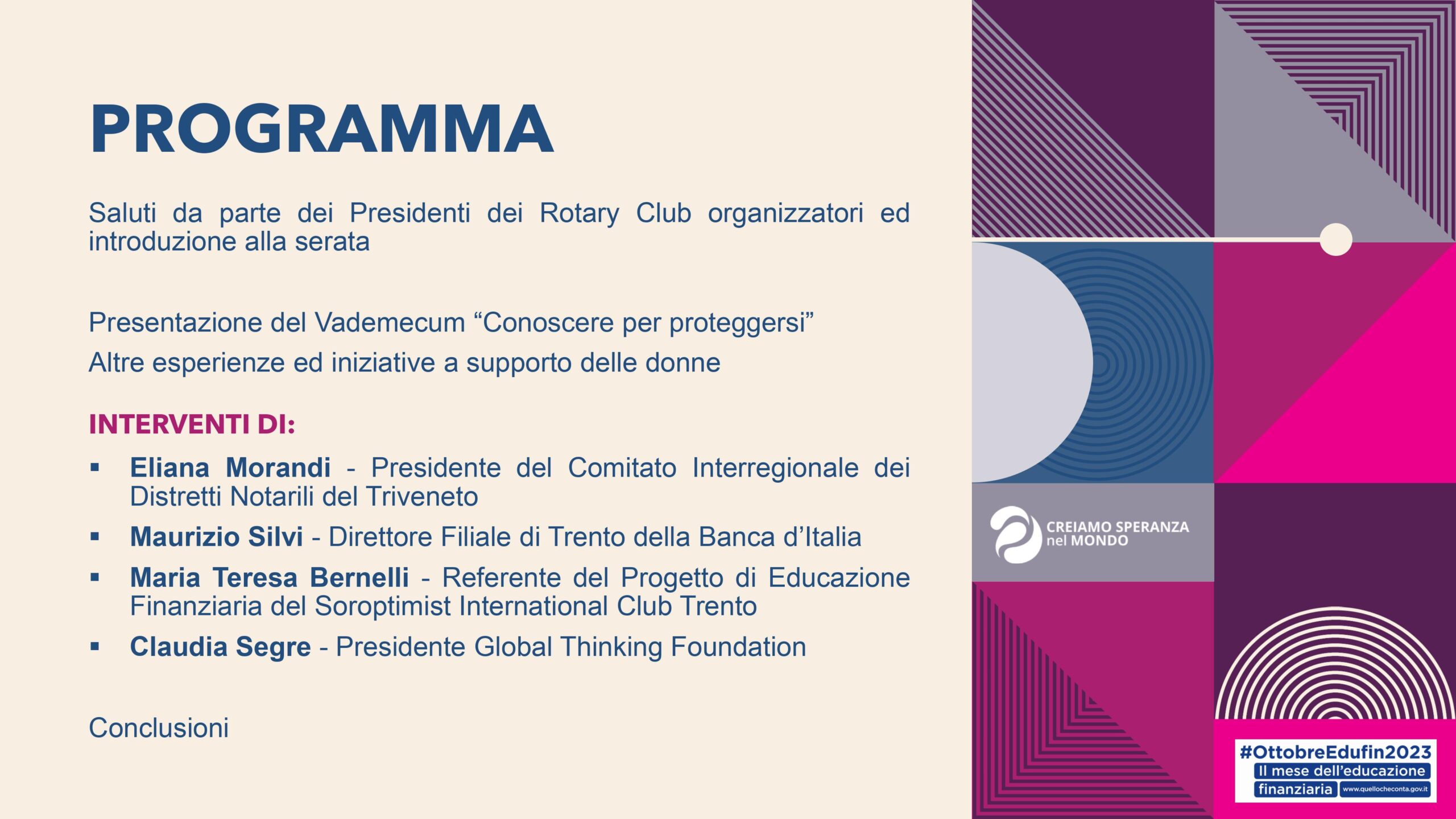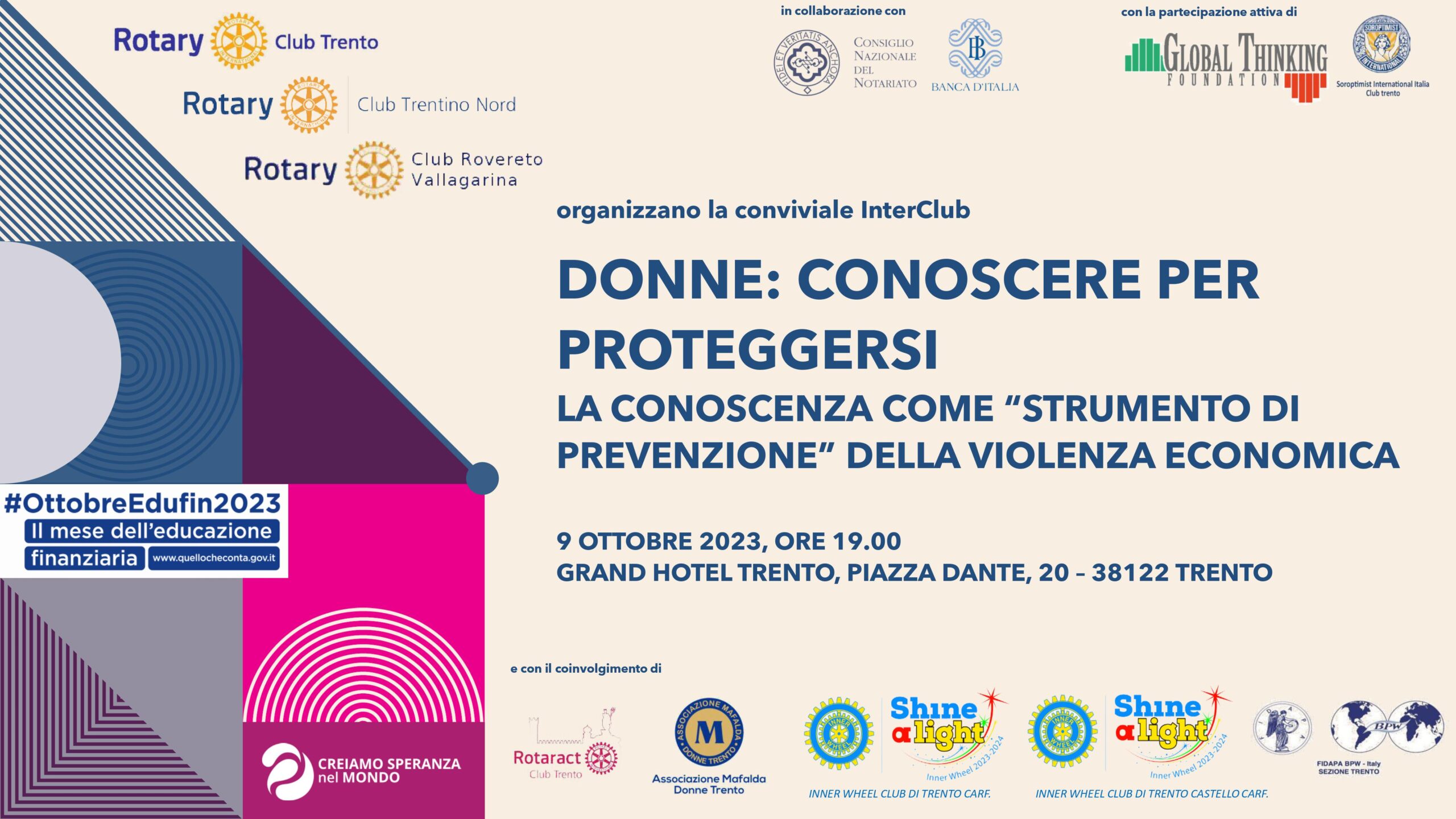 I Rotary Club Trento, Trentino Nord e Rovereto Vallagarina in collaborazione con Global Thinking Foundation, Banca d’Italia – Filiale di Trento, con il Consiglio Notarile di Trento e la Commissione Pari Opportunità del Consiglio Nazionale del Notariato, con la partecipazione di Rotaract Trento, Inner Wheel Trento, Inner Wheel Trento Castello, Associazione Mafalda Donne Trento e altre associazioni in via di definizione, organizzano il giorno 9 ottobre 2023 a partire dalle ore 19.00 presso il Grand Hotel Trento, Piazza Dante, 20 – 38122 Trento un’iniziativa Interclub nel corso della quale affrontare il tema della conoscenza quale strumento di difesa contro possibili soprusi. L’inconsapevolezza (ovvero la non conoscenza) viene spesso sfruttata per compiere prevaricazioni e violenze, che non sono solo fisiche, ma anche economiche, verso le persone più deboli, tra le quali spesso vi sono le donne.