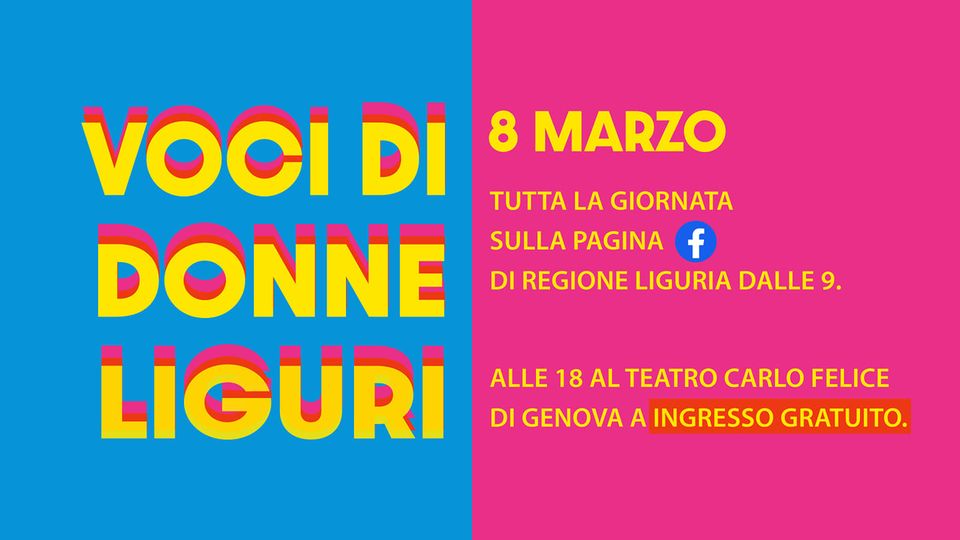 Alle 18 al Teatro Carlo Felice di Genova andrà in scena lo spettacolo, a ingresso gratuito, dallo stesso titolo “Voci di donne liguri”, una serata musicale e di intrattenimento. Per maggiori informazioni visitare la pagina dell’evento sul sito della Regione Liguria: https://bit.ly/35YkepJ.