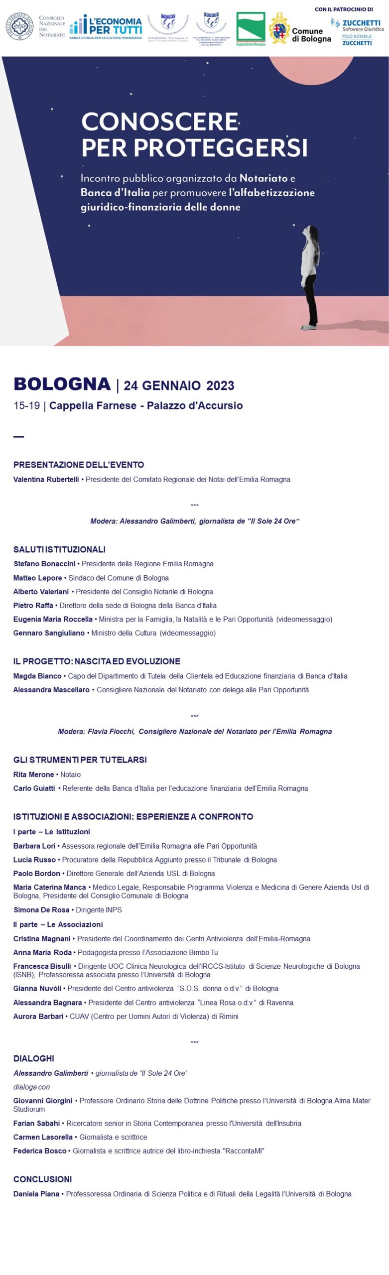 Dopo la presentazione della Presidente del Comitato regionale dei Consigli Notarili dell’Emilia-Romagna Valentina Rubertelli, a portare i saluti iniziali saranno il Presidente della Regione Emilia-Romagna Stefano Bonaccini, il Sindaco di Bologna Matteo Lepore, il Presidente del Consiglio Notarile di Bologna Alberto Valeriani, il Direttore della sede di Bologna di Banca d’Italia Pietro Raffa. A tracciare un bilancio del progetto saranno il Capo del Dipartimento di Tutela della Clientela ed Educazione finanziaria di Banca d’Italia Magda Bianco e il Consigliere Nazionale del Notariato con delega alle Pari Opportunità Alessandra Mascellaro, mentre il vademecum sarà illustrato dal Notaio Rita Merone insieme al Referente di Banca d’Italia per l’educazione finanziaria dell’Emilia-Romagna Carlo Guiatti. All’evento sono stati inoltre invitati la Ministra per la Famiglia, la Natalità e le Pari Opportunità Eugenia Maria Roccella e il Ministro della Cultura Gennaro Sangiuliano.