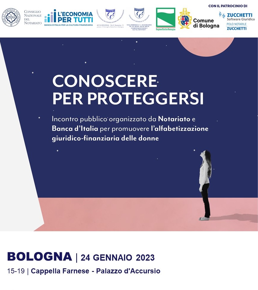 Roma, 18 gennaio 2023 – Si terrà a Bologna martedì 24 gennaio, a partire dalle ore 15.00, presso la Cappella Farnese di Palazzo d’Accursio, l’incontro gratuito e aperto al pubblico organizzato dal Comitato Regionale dei Consigli Notarili dell’Emilia-Romagna insieme al Consiglio Notarile di Bologna e promosso dal Consiglio Nazionale del Notariato in collaborazione con Banca d’Italia, con il patrocinio di Regione Emilia-Romagna e Comune di Bologna, dedicato alla formazione giuridico – finanziaria delle donne, intesa come strumento di prevenzione della violenza economica.
