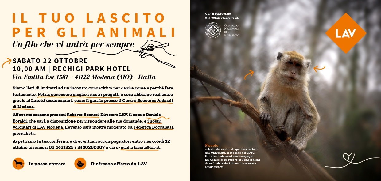 L’incontro vedrà la partecipazione del notaio Daniele Boraldi, che spiegherà cosa è importante sapere sui lasciti solidali e risponderà alle domande dei partecipanti. La discussione sarà moderata dalla giornalista Federica Boccaletti e saranno presenti in sala i nostri volontari di Modena. Saranno condivise le testimonianze dei Soci per sempre LAV, persone che hanno fatto una scelta di amore eterno per gli animali, dedicando un lascito a LAV.