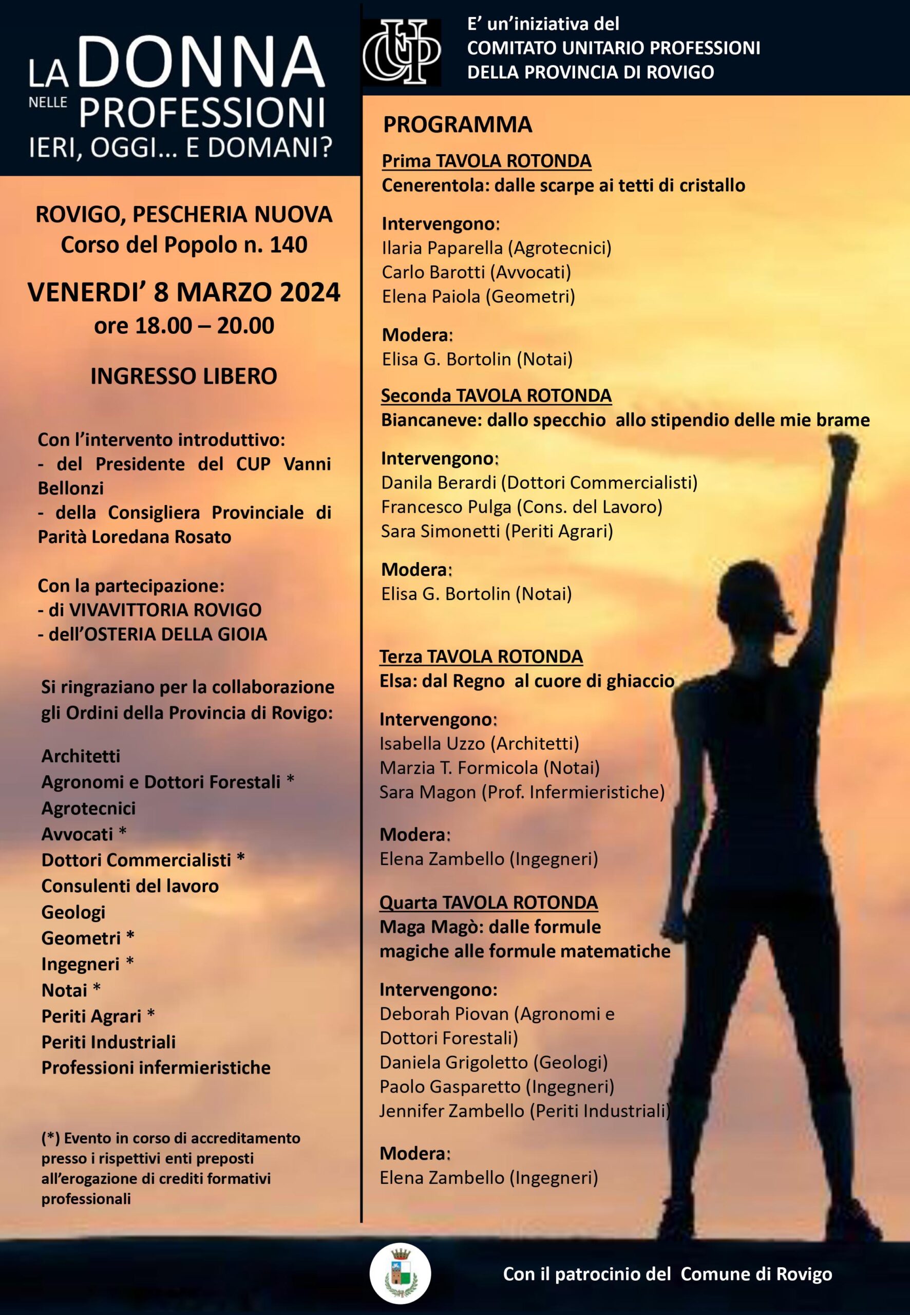 Interverranno: Vanni Bellonzi Presidente del CUP, Loredana Rosato Consigliera Provinciale di Parità, Viva Vittoria Rovigo; nella Prima Tavola Rotonda intitolata “Cenerentola: dalle scarpe ai tetti di cristallo”: Ilaria Paparella (Agrotecnici), Carlo Barotti (Avvocati), Elena Paiola (Geometri); nella Seconda Tavola Rotonda intitolata “Biancaneve: dallo specchio allo stipendio delle mie brame”: Danila Berardi (Dottori Commercialisti), Francesco Pulga (Cons. del Lavoro), Sara Simonetti (Periti Agrari); nella Terza Tavola Rotonda intitolata “Elsa: dal Regno al cuore di ghiaccio”: Isabella Uzzo (Architetti), Marzia T. Formicola (Notai), Sara Magon (Prof. Infermieristiche); nella Quarta Tavola Rotonda intitolata “Maga Magò: dalle formule magiche alle formule matematiche”: Deborah Piovan (Agronomi e Dottori Forestali), Daniela Grigoletto (Geologi), Paolo Gasparetto (Ingegneri), Jennifer Zambello (Periti Industriali). Moderatrici: Elena Zambello (Ingegneri) e Elisa Giovanna Bortolin (Notai).