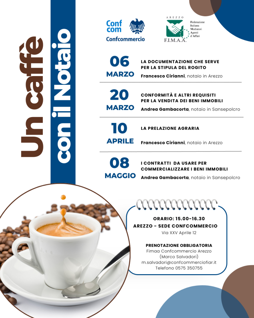 È partito venerdì 6 marzo il nuovo ciclo di incontri “Un caffè con il notaio”, promosso da Fimaa Confcommercio Arezzo, in collaborazione con il Consiglio Notarile di Arezzo, per offrire agli operatori del settore immobiliare un’occasione di confronto diretto e qualificato con i notai.