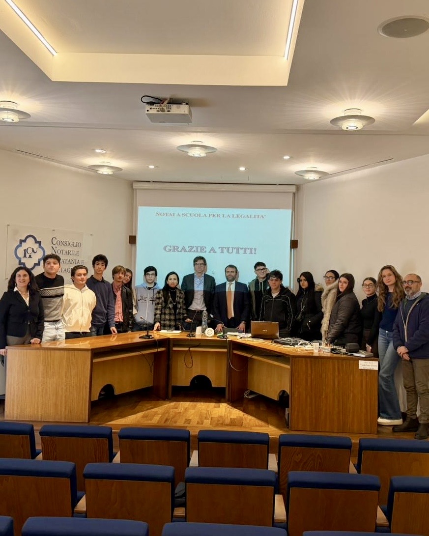 CATANIA – «Solo lo 0,003% dei contratti stipulati davanti a un notaio sfocia in contenzioso, ovvero appena 3 su 100.000 finiscono in Tribunale». È così che il notaio Alfredo Tamburino, referente per la comunicazione sul territorio ha spiegato l’importanza della figura del notaio a coloro che un giorno potrebbero essere i futuri professionisti giuridici. Stamattina, presso la sede del Consiglio Notarile dei Distretti di Catania e Caltagirone, si è svolto un importante incontro tra i notai del territorio e gli studenti dell’Istituto “Leonardo” di Giarre, che ha rappresentato un’occasione di alto valore formativo: i ragazzi hanno potuto conoscere da vicino la professione attraverso il confronto diretto con i protagonisti della categoria. L’iniziativa si inserisce all’interno del più ampio progetto “Pensa oltre… Crea il tuo futuro”, finanziato nell’ambito del Programma Operativo Complementare (POC) “Per la Scuola” 2014-2020 con il Fondo di Rotazione.