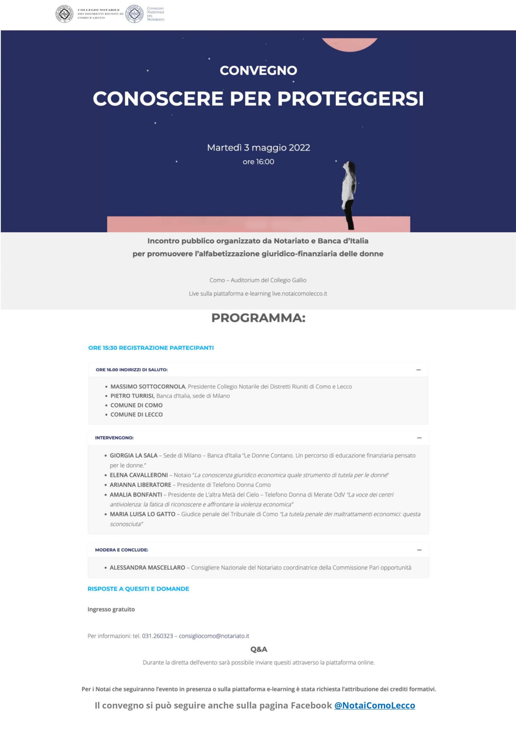 Como, 26 aprile 2022 – Si terrà martedì 3 maggio alle ore 15.30 presso l’Auditorium del Collegio Gallio (Via Barelli 1, Como) l’incontro pubblico promosso dal Collegio Notarile dei Distretti Riuniti di Como e Lecco in collaborazione con la sede di Milano di Banca d’Italia per presentare la Guida “Conoscere per proteggersi”, elaborata dalla Commissione Pari Opportunità del Consiglio Nazionale del Notariato, allo scopo di fornire alle donne gli adeguati strumenti di conoscenza per: prevenire gli abusi, agevolare la loro partecipazione al mondo del lavoro e contribuire a realizzare una vera parità di genere.