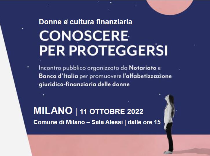 Milano, 7 ottobre 2022 – In occasione del mese dell’educazione finanziaria, si terrà l’11 ottobre presso la Sala Alessi a partire dalle ore 15:00 l’incontro aperto al pubblico “Conoscere per proteggersi: donne e cultura finanziaria” organizzato dal Consiglio notarile di Milano con il Patrocinio del Comune di Milano e promosso dal Consiglio nazionale del Notariato in collaborazione con Banca d’Italia. L’incontro intende promuovere la diffusione della cultura giuridico-finanziaria tra le donne, come strumento di prevenzione della violenza economica, partendo dal dialogo con le istituzioni e le principali associazioni che operano a tutela delle donne.