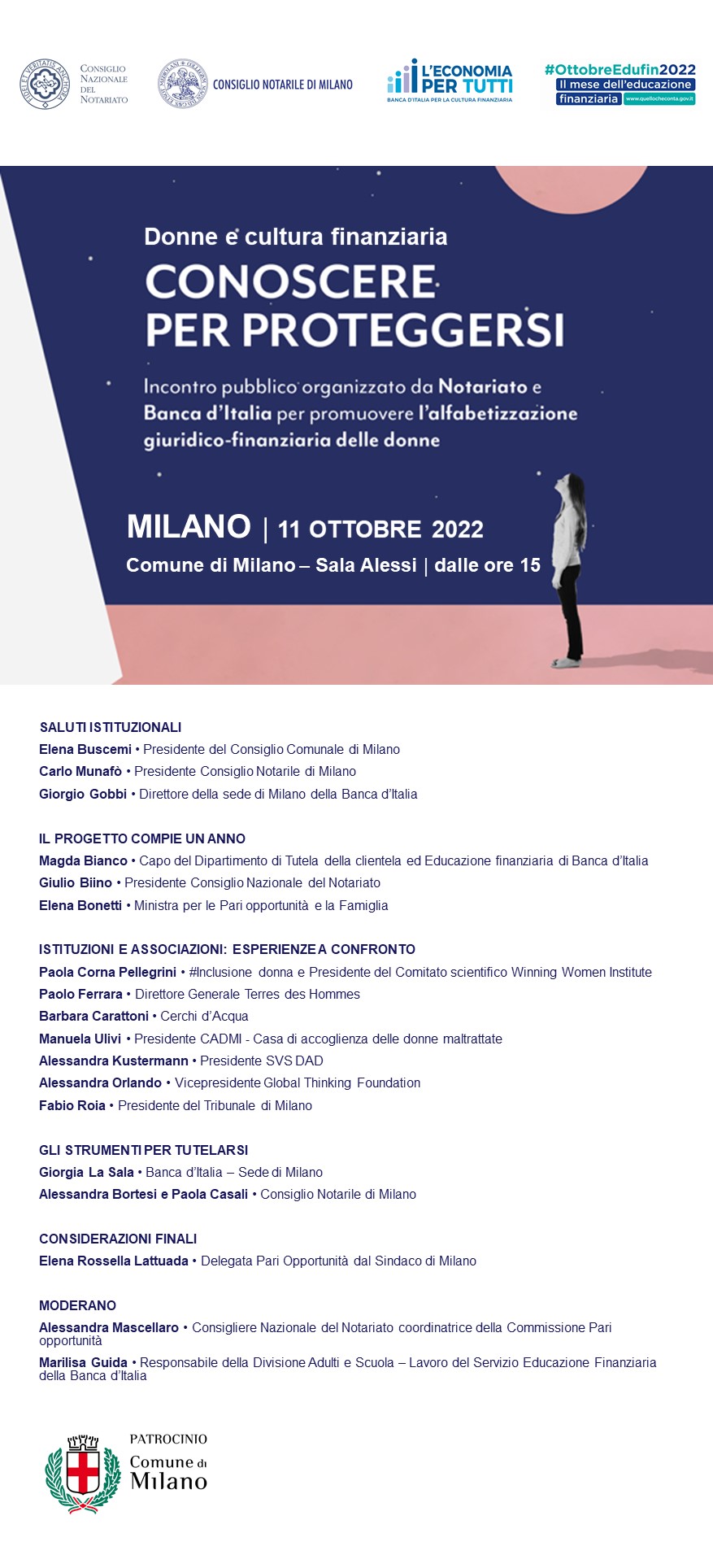 All’incontro, aperto dalla Presidente del Consiglio Comunale di Milano, Elena Buscemi, interverranno, tra gli altri, Elena Bonetti, Ministro per le Pari opportunità e la Famiglia, Elena Lattuada, delegata per le Pari Opportunità del Comune di Milano, il magistrato Fabio Roia, Presidente del Tribunale di Milano, Giulio Biino, Presidente del Consiglio Nazionale del Notariato, Magda Bianco, Capo del Dipartimento di Tutela della clientela ed Educazione finanziaria di Banca d’Italia, insieme ai rappresentanti delle associazioni locali che operano a tutela delle donne, #Inclusione donna, Terres des Hommes, Cerchi d’Acqua, CADMI, Casa di accoglienza delle donne maltrattate, SVS DAD, Global Thinking Foundation.