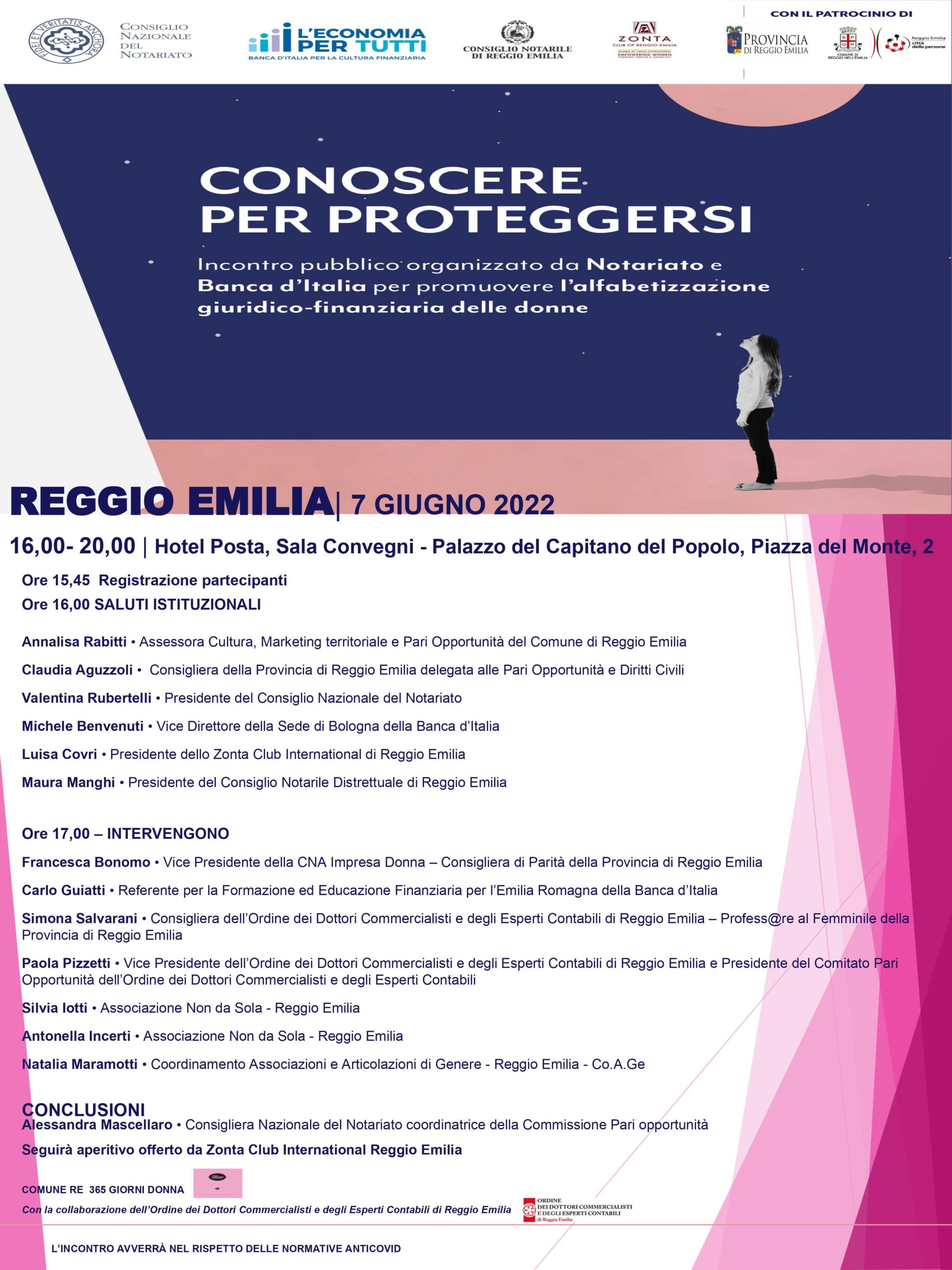L’evento vedrà anche la partecipazione dell’Assessora alla Cultura, Marketing territoriale e Pari Opportunità del Comune Annalisa Rabitti, della Consigliera della Provincia con delega alle Pari Opportunità e Diritti Civili Claudia Aguzzoli, della Presidente del Consiglio Nazionale del Notariato Valentina Rubertelli, del Vice Direttore della Sede di Bologna della Banca d’Italia Michele Benvenuti, della Presidente dello Zonta Club International di Reggio Emilia Luisa Covri e della Presidente del Consiglio Notarile Distrettuale Maura Manghi.