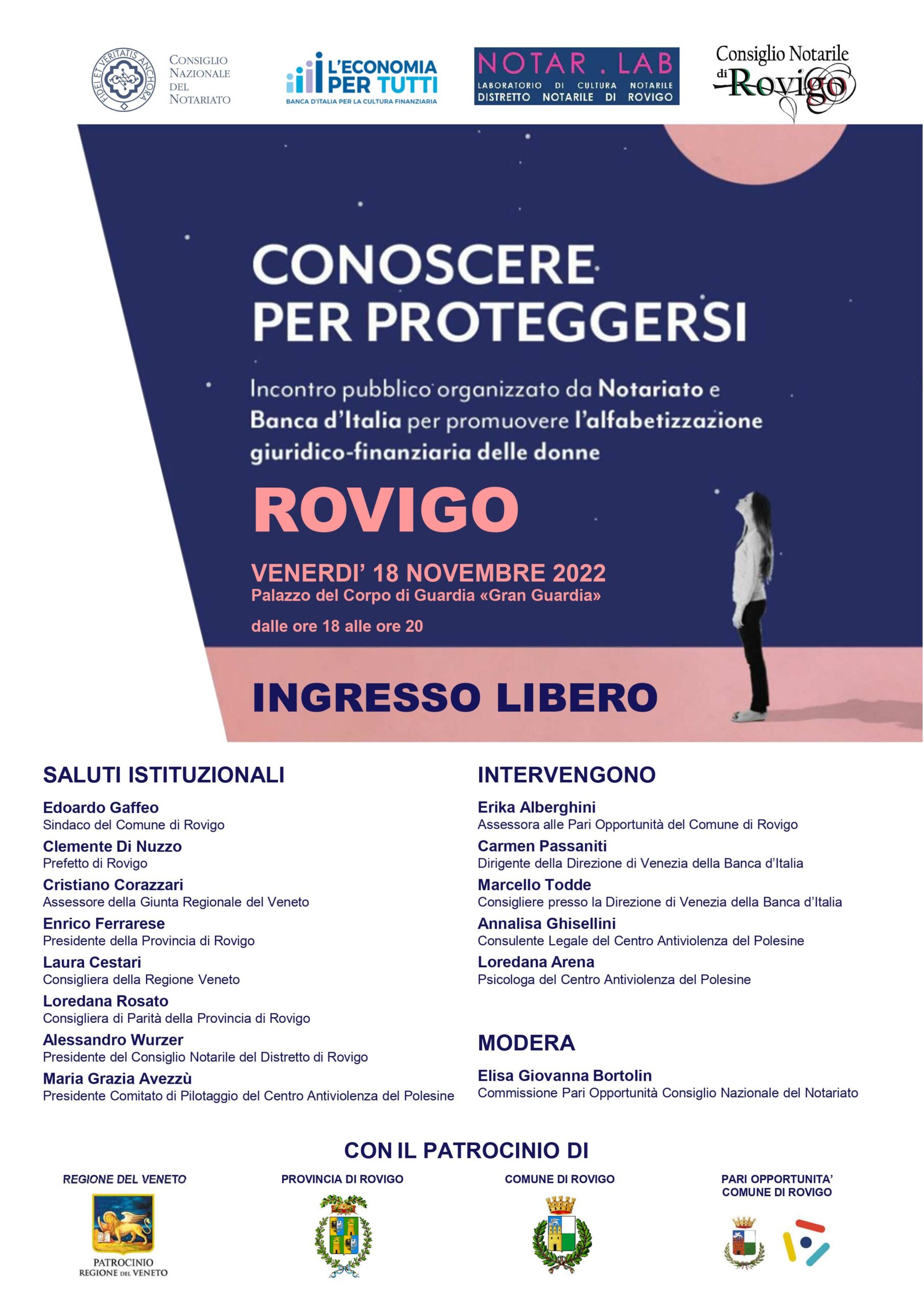 Venerdì 18 novembre alle ore 18, a Rovigo presso la Sala della Gran Guardia, il Consiglio Notarile di Rovigo e Notar.Lab Services presenteranno la Guida “Conoscere per proteggersi” elaborata dalla Commissione Pari Opportunità del Consiglio Nazionale del Notariato, allo scopo di fornire alle donne gli adeguati strumenti di conoscenza per prevenire gli abusi, agevolare la loro partecipazione al mondo del lavoro e contribuire a realizzare una vera parità di genere.