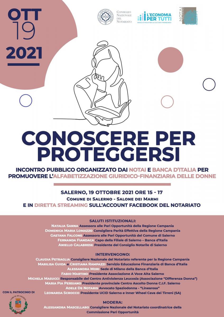 L’incontro che sarà trasmesso in diretta streaming sul profilo Facebook del Consiglio Nazionale del Notariato è il primo evento sul territorio – con ilpatrocinio del Dipartimento per le Pari Opportunità della Presidenza del Consiglio dei Ministri e del Comune di Salerno – organizzato sulla base dell’accordo sottoscritto tra Notariato e Banca d’Italia per promuovere l’alfabetizzazione giuridico-finanziaria delle donne.