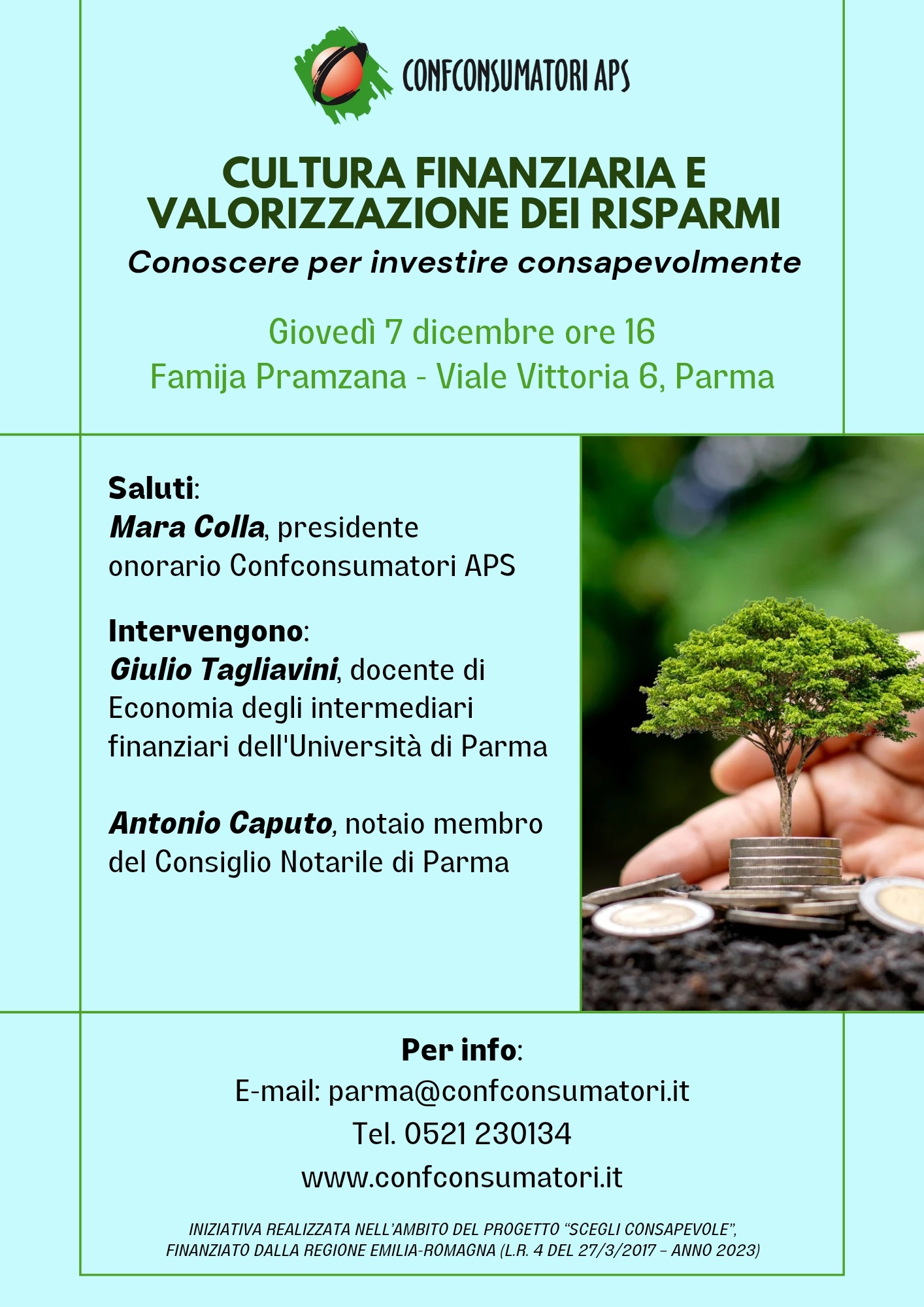 Parma, 5 dicembre 2023 – Tante famiglie si domandano come far fruttare i propri risparmi ma hanno il timore di imbattersi, soprattutto nell’attuale contesto economico, in investimenti sbagliati e inadatti a rispondere alle proprie esigenze. Con l’obiettivo di fornire strumenti utili per migliorare la educazione finanziaria delle persone, Confconsumatori organizza a Parma l’incontro “Cultura finanziaria e valorizzazione dei risparmi, conoscere per investire consapevolmente”. L’evento, gratuito e aperto alla cittadinanza, si terrà il prossimo giovedì 7 dicembre presso il circolo Famija Pramzana, in viale Vittoria 6, a partire dalle ore 16.