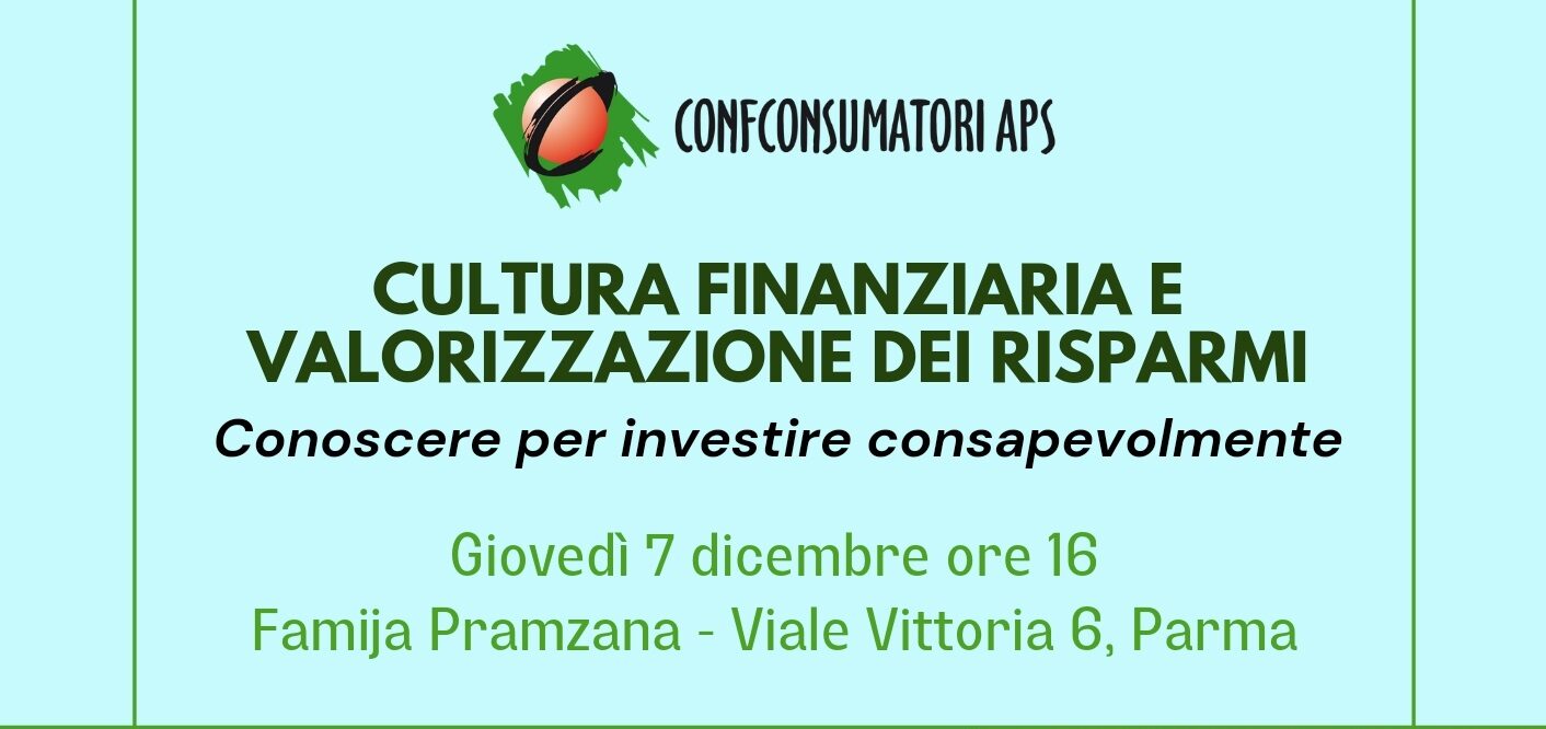 Parma, 5 dicembre 2023 – Tante famiglie si domandano come far fruttare i propri risparmi ma hanno il timore di imbattersi, soprattutto nell’attuale contesto economico, in investimenti sbagliati e inadatti a rispondere alle proprie esigenze. Con l’obiettivo di fornire strumenti utili per migliorare la educazione finanziaria delle persone, Confconsumatori organizza a Parma l’incontro “Cultura finanziaria e valorizzazione dei risparmi, conoscere per investire consapevolmente”. L’evento, gratuito e aperto alla cittadinanza, si terrà il prossimo giovedì 7 dicembre presso il circolo Famija Pramzana, in viale Vittoria 6, a partire dalle ore 16.