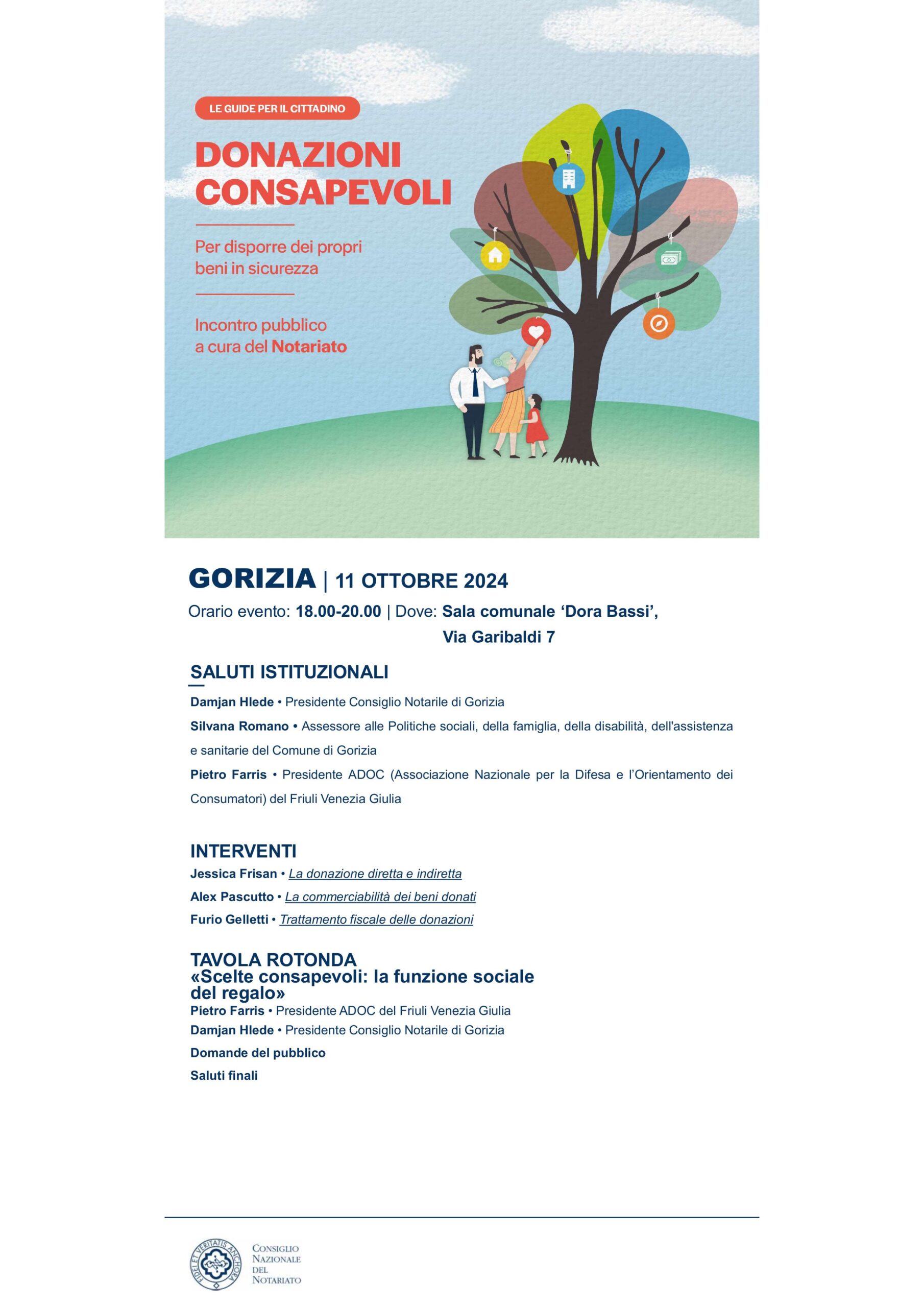 Gorizia, 8 ottobre 2024 – Si terrà il giorno 11 ottobre 2024, a Gorizia, nella “Sala Dora Bassi” l’incontro pubblico promosso dal Consiglio Notarile di Gorizia per presentare l’edizione aggiornata della guida “Donazioni consapevoli”, elaborata dal Consiglio Nazionale del Notariato e dalle Associazioni dei Consumatori, il vademecum che fornisce prime informazioni utili per disporre dei propri beni in sicurezza qualora si intendesse già disporre, in vita, di tutto o parte del proprio patrimonio.