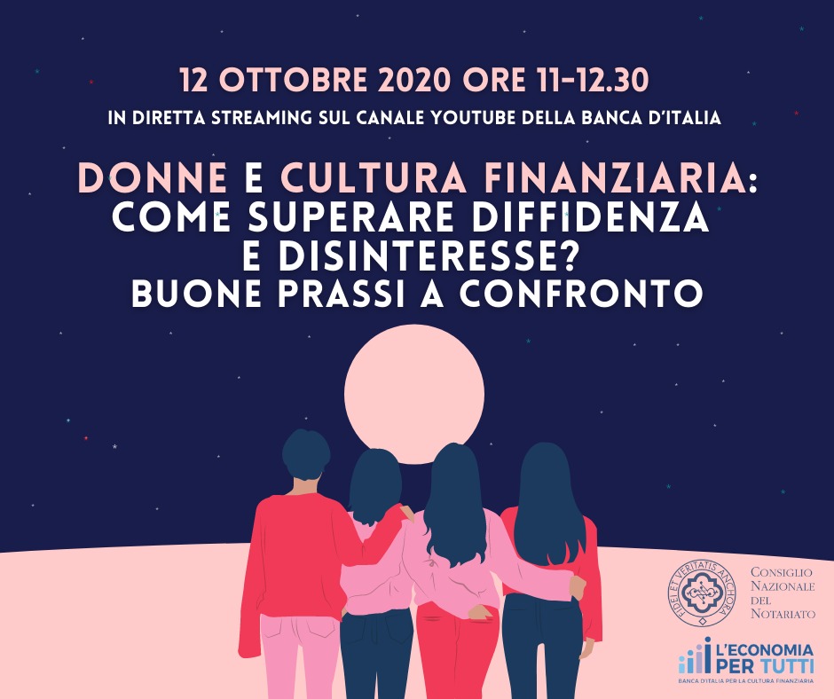 Donne e cultura finanziaria, se ne parlerà il 12 ottobre alle 11.00 in diretta video con Piero Cipollone, VDG della Banca d’Italia e la Ministra per le Pari Opportunità e la Famiglia, Elena Bonetti che apriranno l’incontro organizzato, nell’ambito delle iniziative per il mese dell’educazione finanziaria, dalla Banca d’Italia e dal Consiglio Nazionale del Notariato.