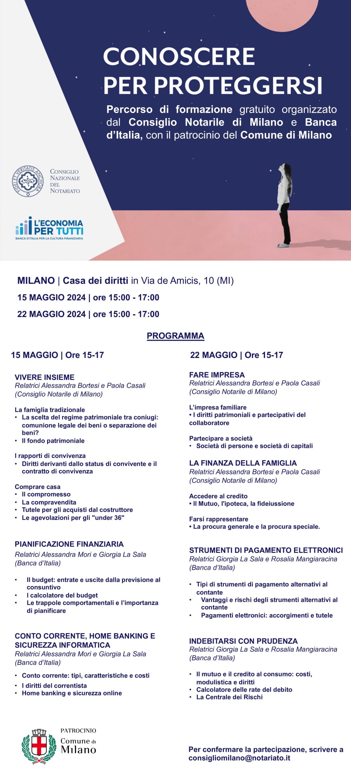 Gli incontri, patrocinati dal Comune di Milano, si terranno il 15 e il 22 maggio dalle 15:00 alle 17:00 presso la Casa dei Diritti in via De Amicis n.10 e hanno lo scopo di approfondire le tematiche giuridiche ed economiche utili a favorire l’acquisizione o il perfezionamento di competenze giuridico-economiche da parte delle responsabili e/o delle operatrici dei CAV, che potranno mettere a disposizione delle proprie assistite quanto appreso. Nel corso dei due incontri, i notai del Consiglio Notarile di Milano, Alessandra Bortesi e Paola Casali, illustreranno gli argomenti contenuti nella Guida “Conoscere per proteggersi”, inerenti agli istituti giuridici che si affrontano nella quotidianità della vita familiare: vivere insieme, fare impresa, la finanza della famiglia. Le responsabili di Milano di Banca d’Italia, Giorgia La Sala, Alessandra Mori e Rosalia Mangiaracina, tratteranno gli argomenti contenuti nel percorso di finanza personale “Le donne contano” disponibile sul sito L’Economia per tutti – Banca d’Italia: pianificazione finanziaria, strumenti di pagamento elettronici, conto corrente, home banking e sicurezza informatica, indebitarsi con prudenza.