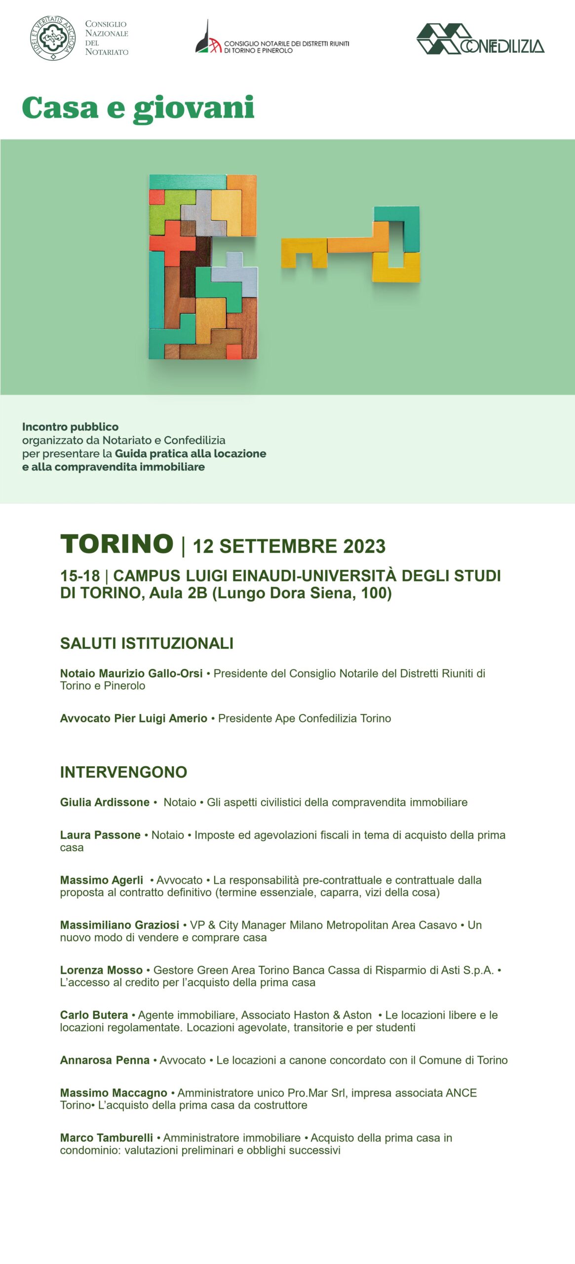 All’incontro del 12 settembre, aperto al pubblico, partecipano Maurizio Gallo-Orsi, Presidente del Consiglio Notarile dei Distretti Riuniti di Torino e Pinerolo, Pier Luigi Amerio, Presidente Ape Confedilizia Torino, i notai Giulia Ardissone e Laura Passone, gli avvocati Massimo Agerli e Annarosa Penna, Lorenza Mosso, gestore Green Area Torino di Banca Cassa di Risparmio di Asti S.p.A., Massimiliano Graziosi, VP & City Manager Milano Metropolitan Area Casavo, Carlo Butera, agente immobiliare Associato Haston & Aston, Massimo Maccagno, Amministratore unico Pro.Mar Srl, impresa associata ANCE Torino e Marco Tamburelli, Amministratore immobiliare.
