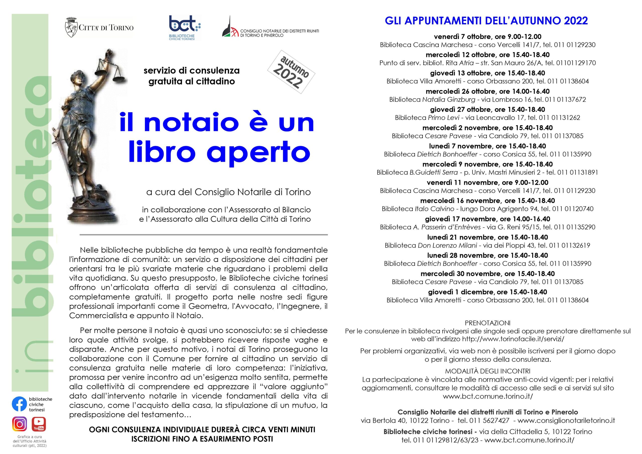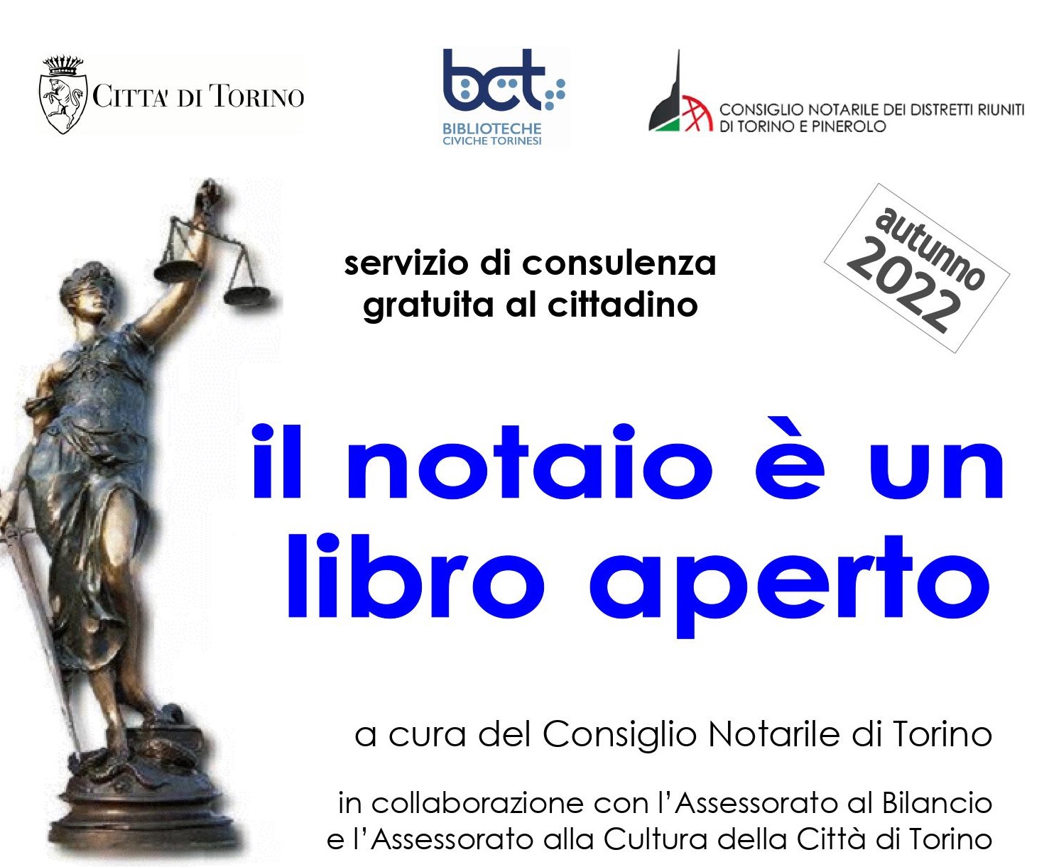 Dal 7 ottobre al 1 dicembre 2022, i notai torinesi forniranno presso le Biblioteche civiche della città, su prenotazione, consulenza gratuita della durata di circa 20 minuti su tematiche fondamentali per la vita di ciascuno, quali ad esempio l’acquisto della casa, la stipula di un mutuo, la predisposizione del testamento.