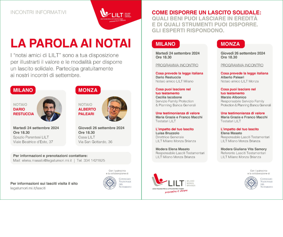 Milano, 11 settembre – LILT Milano Monza Brianza, con la collaborazione del Consiglio Notarile di Milano e il patrocinio del Consiglio Nazionale del Notariato, organizza due incontri gratuiti nel mese di settembre a Milano e a Monza. I “notai amici di LILT” illustreranno il valore e le modalità per disporre un lascito solidale. Lasciare i propri beni, o anche solo una parte, è un gesto di solidarietà importante e i due incontri sono pensati proprio per sciogliere ogni dubbio legato alle disposizioni testamentarie a favore di LILT.