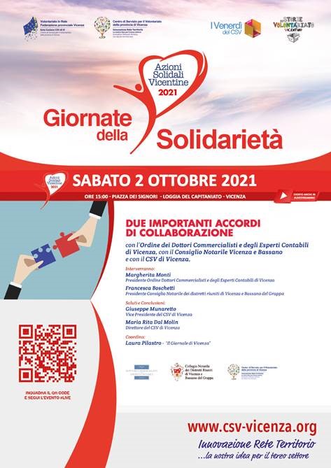 In occasione delle Giornate della Solidarietà, il CSV Vicenza promuoverà Azioni Solidali Vicentine, manifestazione organizzata annualmente per riunire nella Piazza principale del capoluogo tutto il Volontariato della provincia. Questa 21^ edizione, in cui si celebrerà il valore della Comunità, prevede numerosi appuntamenti per diffondere i valori del Volontariato e della cittadinanza attiva.