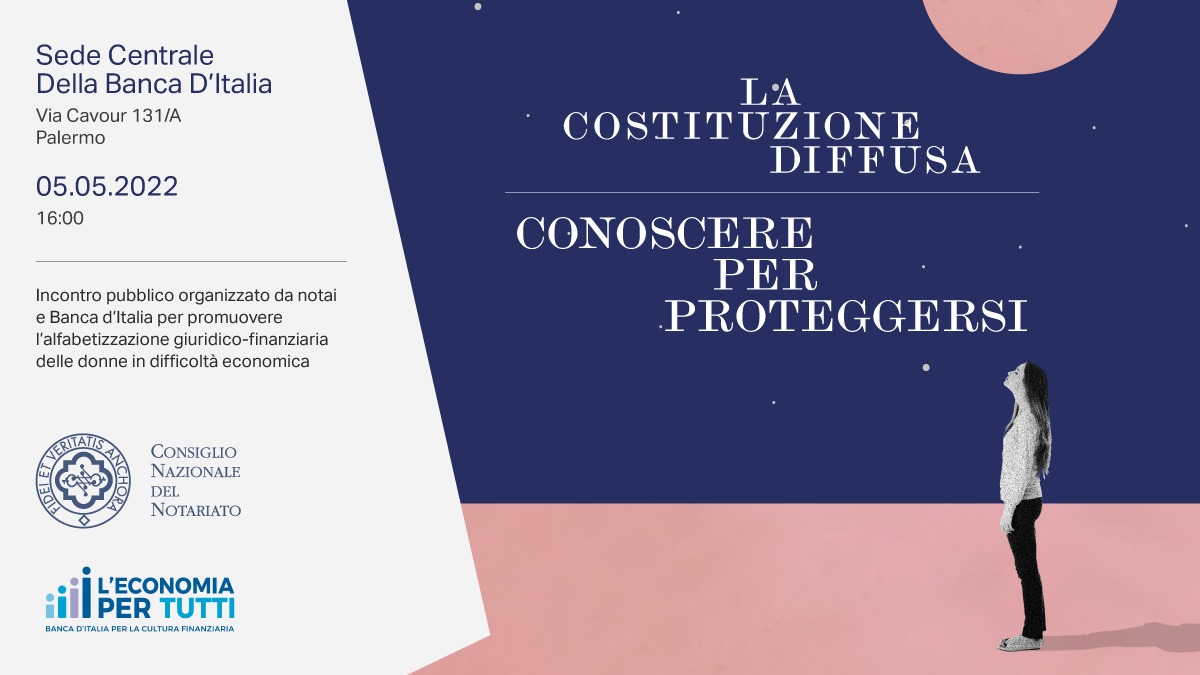 Si terrà a Palermo giovedì 5 maggio, dalle ore 16 alle 19, presso la sede centrale della Banca d’Italia (via Cavour 131/A), nell’ambito della Rassegna “La Costituzione diffusa”, l’incontro aperto al pubblico organizzato dal Consiglio Notarile di Palermo e promosso dal Consiglio Nazionale del Notariato in collaborazione con Banca d’Italia con il coinvolgimento delle associazioni e dei centri antiviolenza locali, nonché della sezione femminile della Casa Circondariale A. Lorusso Pagliarelli di Palermo, per fornire alle donne in condizione di fragilità sociale e/o soggette a violenza economica gli adeguati strumenti di conoscenza per prevenire gli abusi, agevolare la loro partecipazione al mondo del lavoro e contribuire a realizzare una vera parità di genere.