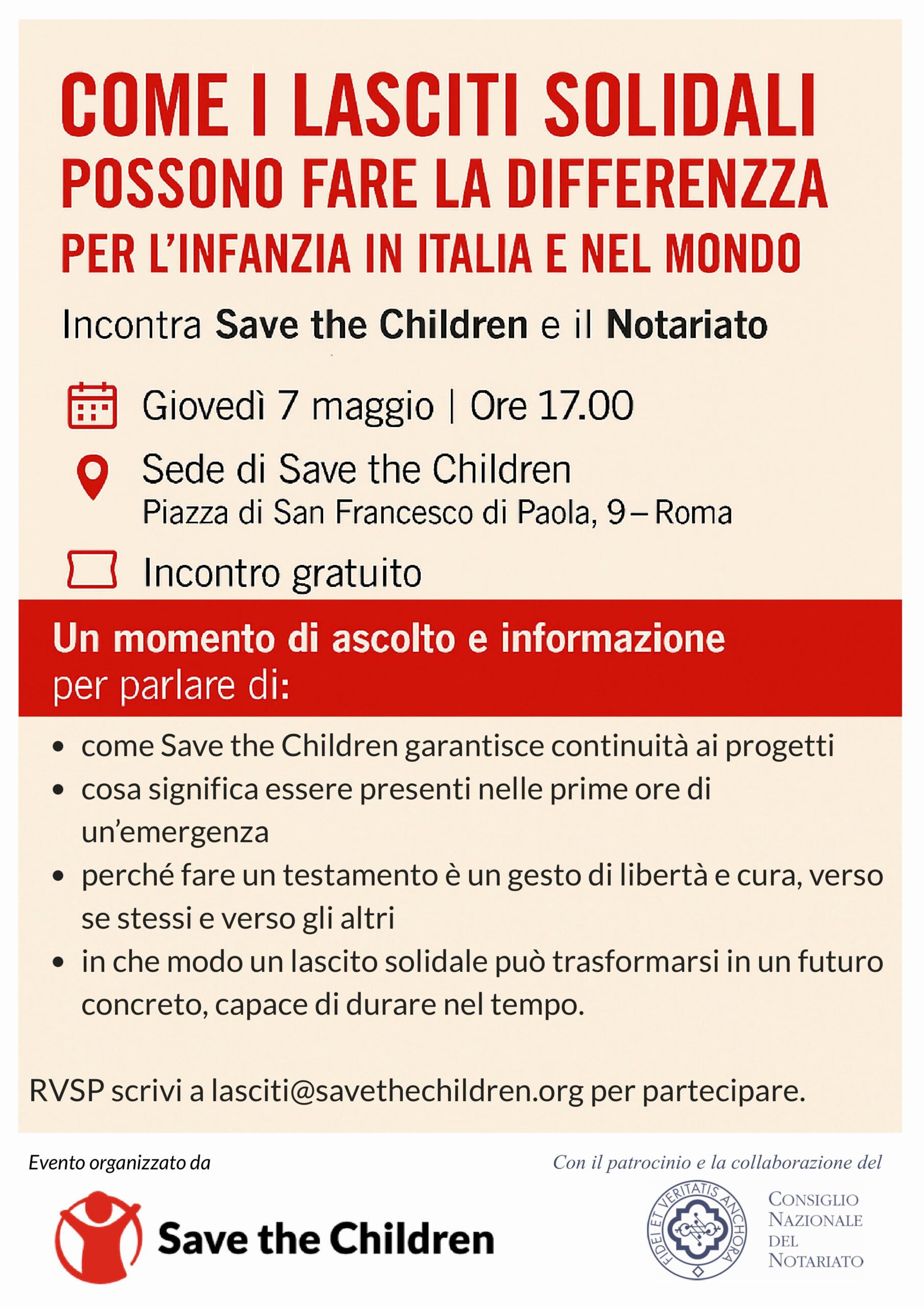 Per partecipare è necessario prenotare il proprio posto scrivendo a lasciti@savethechildren.org.