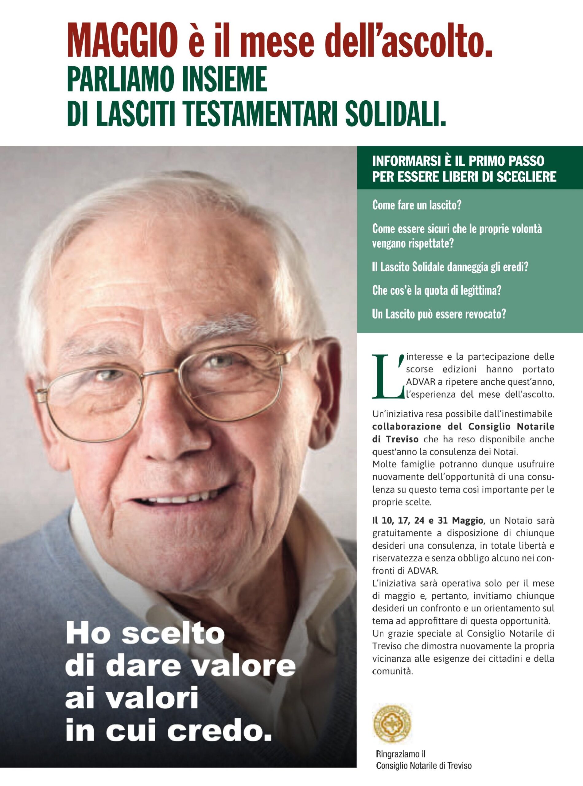 L’Associazione Advar onlus promuove, grazie alla collaborazione per il quarto anno successivo del Consiglio Notarile di Treviso, “Maggio è il mese dell’ascolto”: una serie di appuntamenti informativi sui lasciti testamentari.