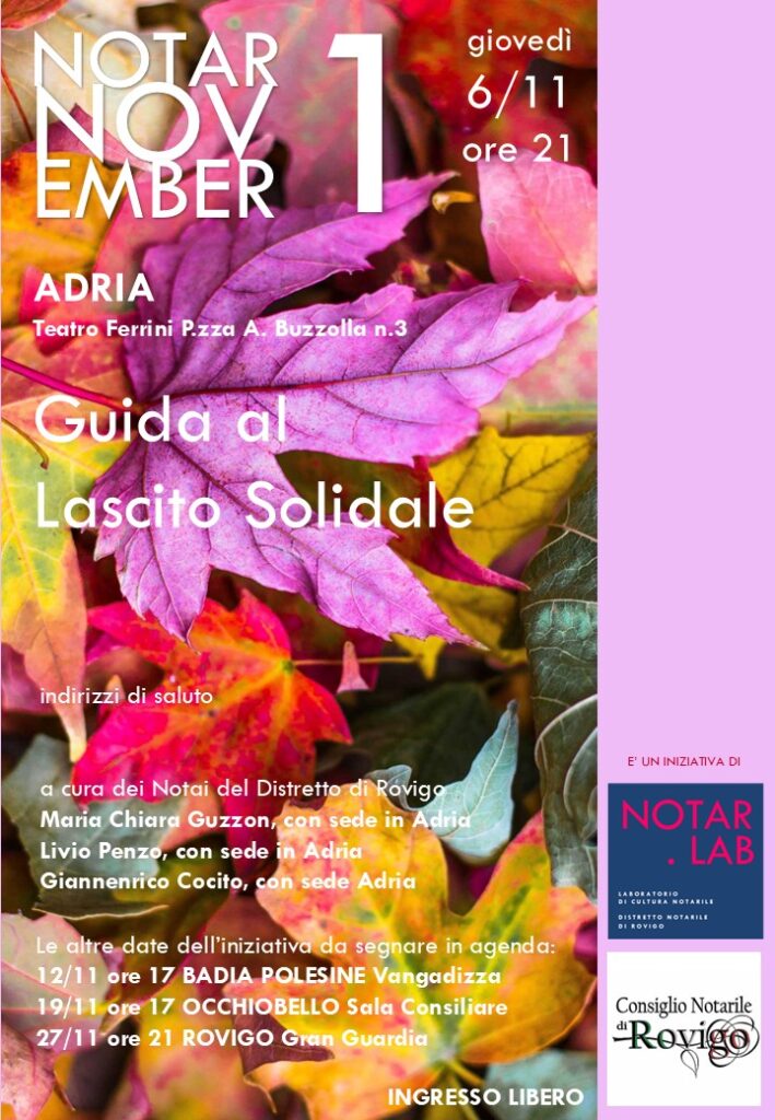 Giovedì 6 novembre, alle ore 21.00, presso il Teatro Ferrini di Adria, verrà illustrato come il Consiglio Nazionali del Notariato patrocini e collabori con numerosi Enti del Terzo Settore per la realizzazione delle Campagne Lasciti Testamentari, che molto spesso prevedono incontri informativi sul tema dei lasciti solidali, realizzati grazie all’attività sul territorio attuata dai Consigli Notarili.