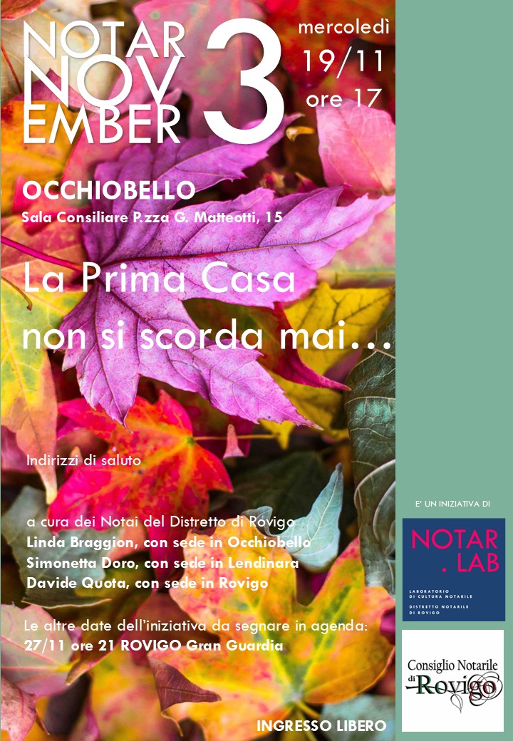 Il terzo appuntamento in calendario è quello di mercoledì 19 novembre, alle ore 17.00, presso la Sala Consiliare di Occhiobello: i notai Linda Braggion, Simonetta Doro e Davide Quota illustreranno i contenuti della Guida “Casa e Giovani” concepita per essere uno strumento a disposizione della generazione dei “tecnodotati”, ossia di quella fascia sociale che soffre la difficoltà della sovrabbondanza di informazione.
