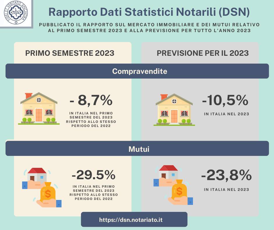 Nei primi sei mesi del 2023 si è registrato in Italia un calo dell’8,7% delle compravendite di abitazioni (da 303.375 a 277.052) rispetto allo stesso periodo del 2022, mentre i mutui per l’acquisto della casa nei primi sei mesi del 2023 sono diminuiti del 29,5% rispetto allo stesso periodo del 2022. Per la fine del 2023, sulla base dello studio statistico a cura del Consiglio Nazionale del Notariato e dei nuovi dati semestrali 2023, ci si aspetta un calo del mercato del 10,5%. In merito ai mutui, per l’anno 2023, si prospetta una riduzione dei finanziamenti del -23,8%.
