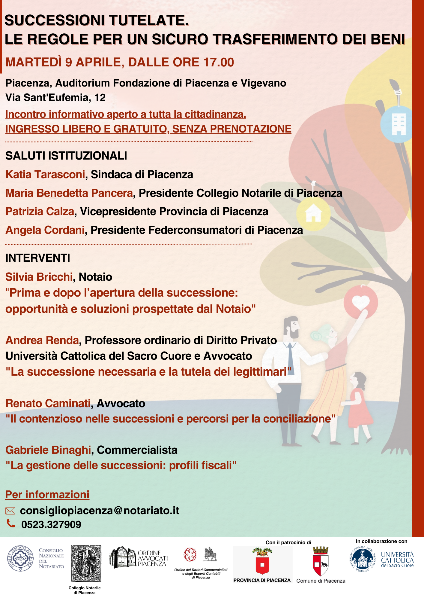 A introdurre il pomeriggio saranno la Sindaca di Piacenza Katia Tarasconi, la Presidente del Collegio Notarile Maria Benedetta Pancera, la Vicepresidente della Provincia Patrizia Calza e la Presidente di Federconsumatori Piacenza Angela Cordani.