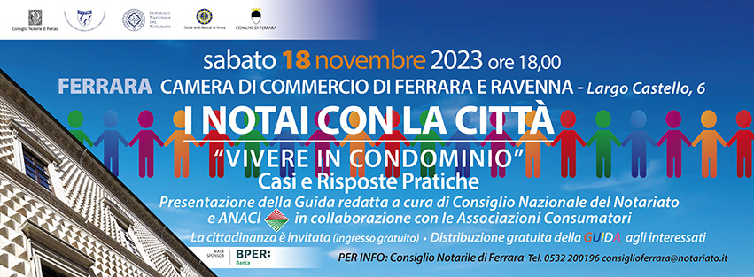 Per questo, sabato 18 novembre alle ore 18.00 si terrà, a Ferrara, presso la Camera di Commercio di Ferrara e Ravenna (in Largo Castello, 6), Vivere in condominio. Casi e risposte pratiche, incontro pubblico e gratuito, aperto a tutta la cittadinanza, nel corso del quale sarà presentata la Guida sul tema, redatta dal Consiglio Nazionale del Notariato insieme alle Associazioni dei Consumatori ed ANACI (Associazione Nazionale Amministratori Condominiali e Immobiliari).