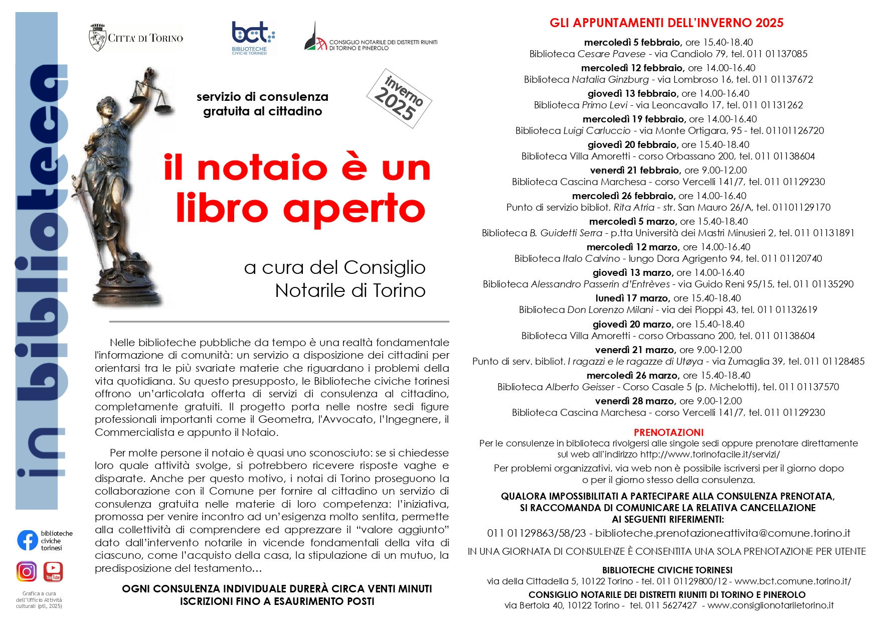 Per le consulenze in biblioteca rivolgersi alle singole sedi oppure prenotare direttamente sul web all’indirizzo www.torinofacile.it/servizi/. Per problemi organizzativi, via web non è possibile iscriversi per il giorno dopo o per il giorno stesso della consulenza (in questi casi verificare la possibilità di un inserimento direttamente col personale della biblioteca).